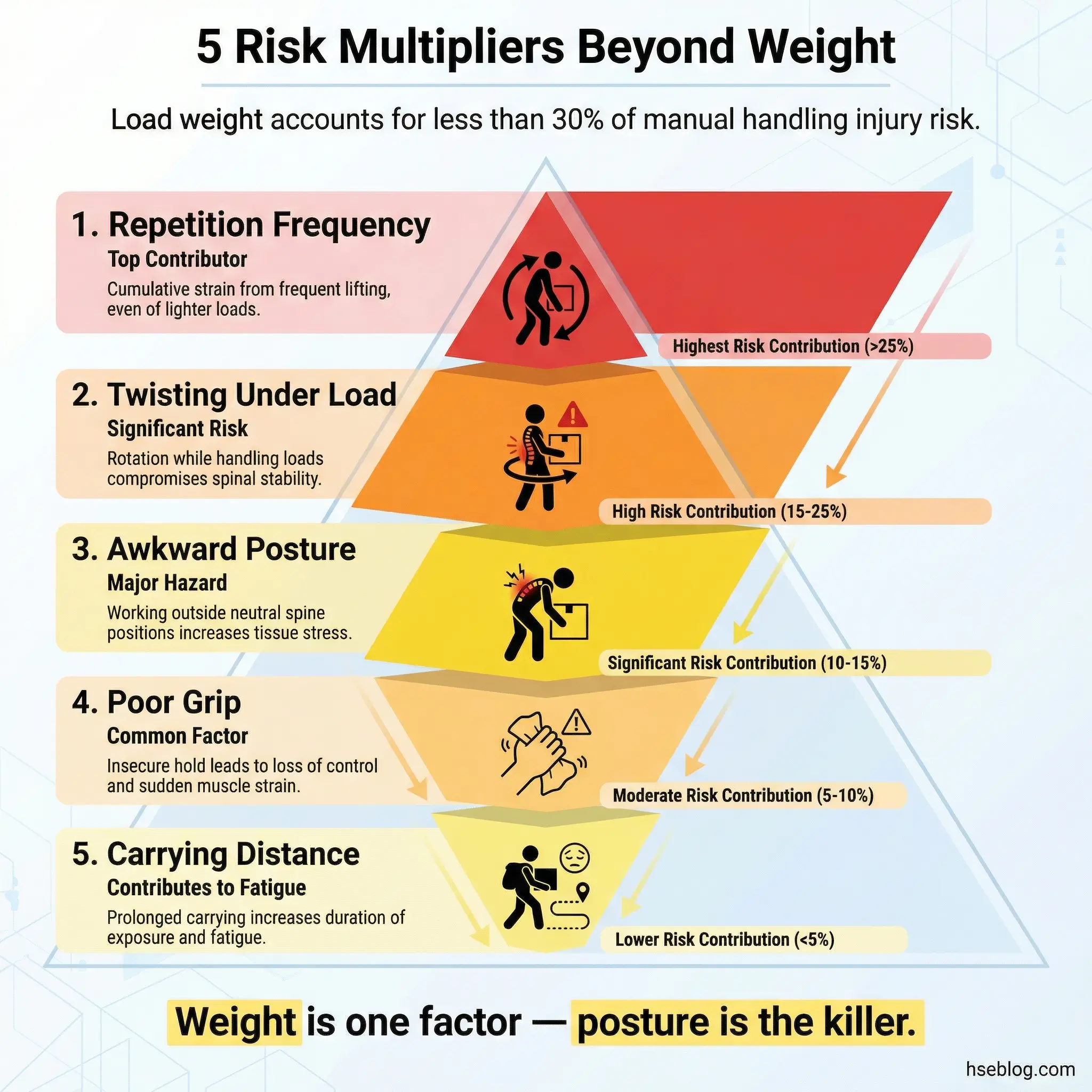 - The hazard isn’t just heavy loads — frequency, posture, grip, distance, and environment multiply risk faster than weight alone