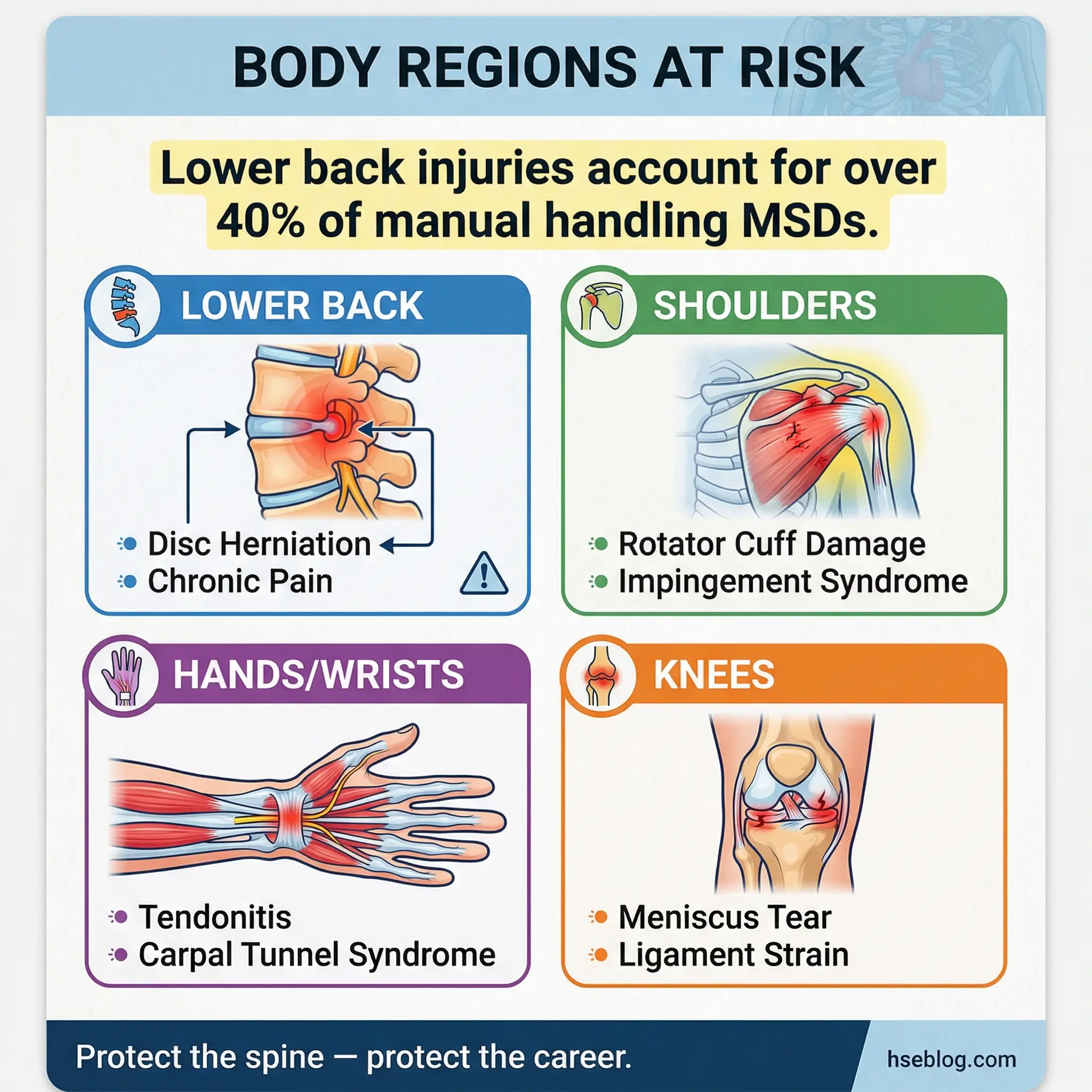 - Lower back injuries — disc herniation, lumbar sprains, and chronic low back pain account for the largest share of manual handling MSDs; the L4-L5 and L5-S1 disc levels are most frequently damaged by combined flexion and rotation under load