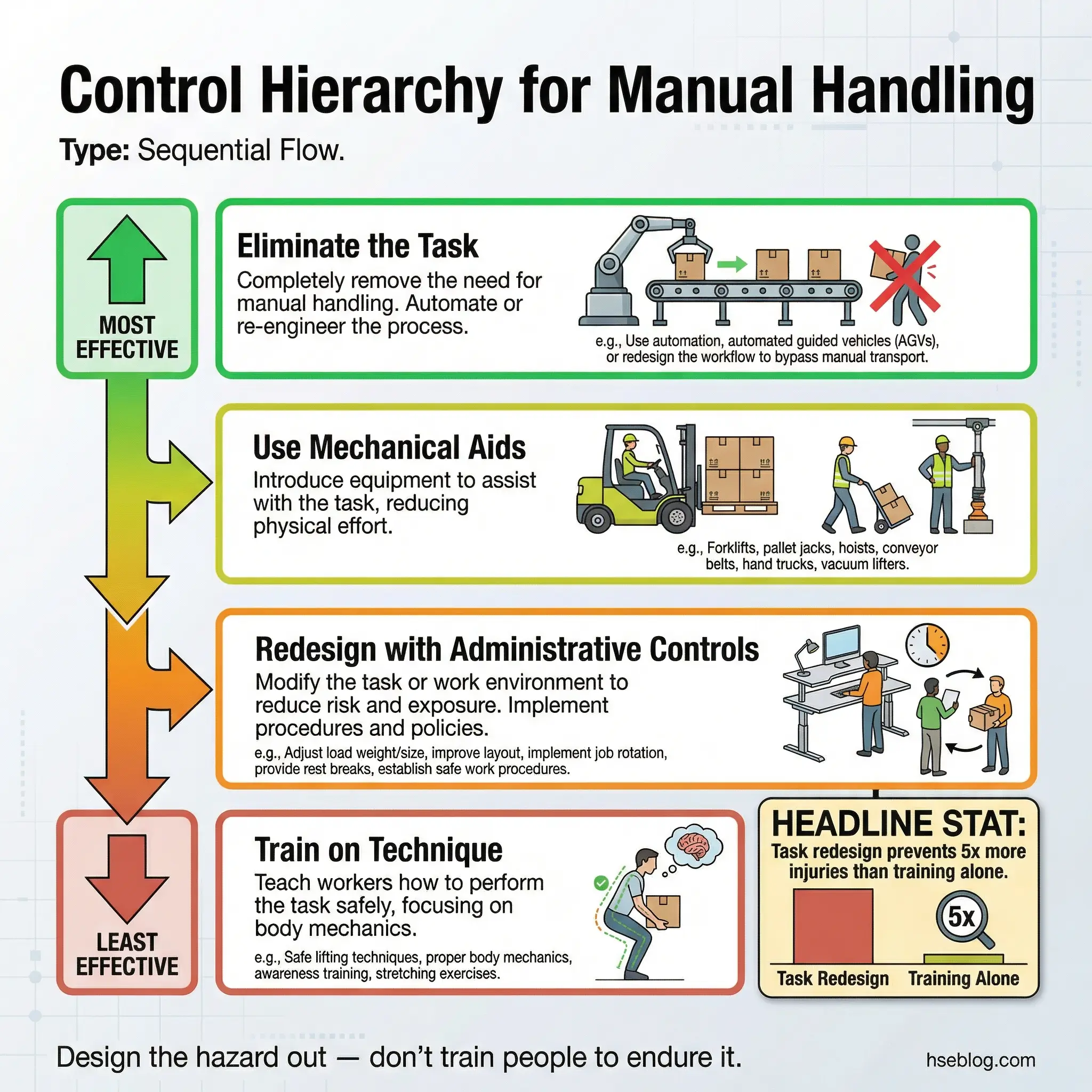 Controls that actually reduce manual handling injuries follow a clear hierarchy. The most effective controls eliminate the handling task entirely. The least effective — and most commonly relied on — are training and PPE. Every organization I’ve audited over-invests in training and under-invests in task redesign.