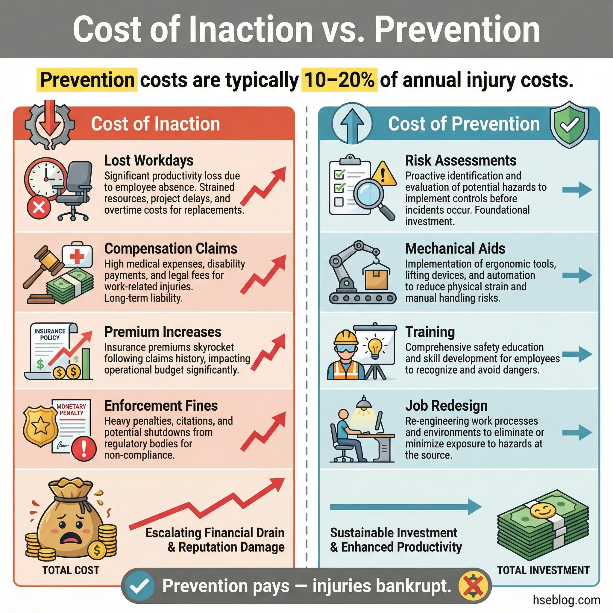 I once consulted for a logistics operation that had dismissed manual handling training and assessment as “unnecessary overhead.” In one calendar year, they recorded 23 back injuries, 4,100 lost work days, and over $800,000 in direct costs. Their insurance premiums doubled the following year. The risk assessments and mechanical aids they eventually implemented cost less than a single quarter’s injury bill.