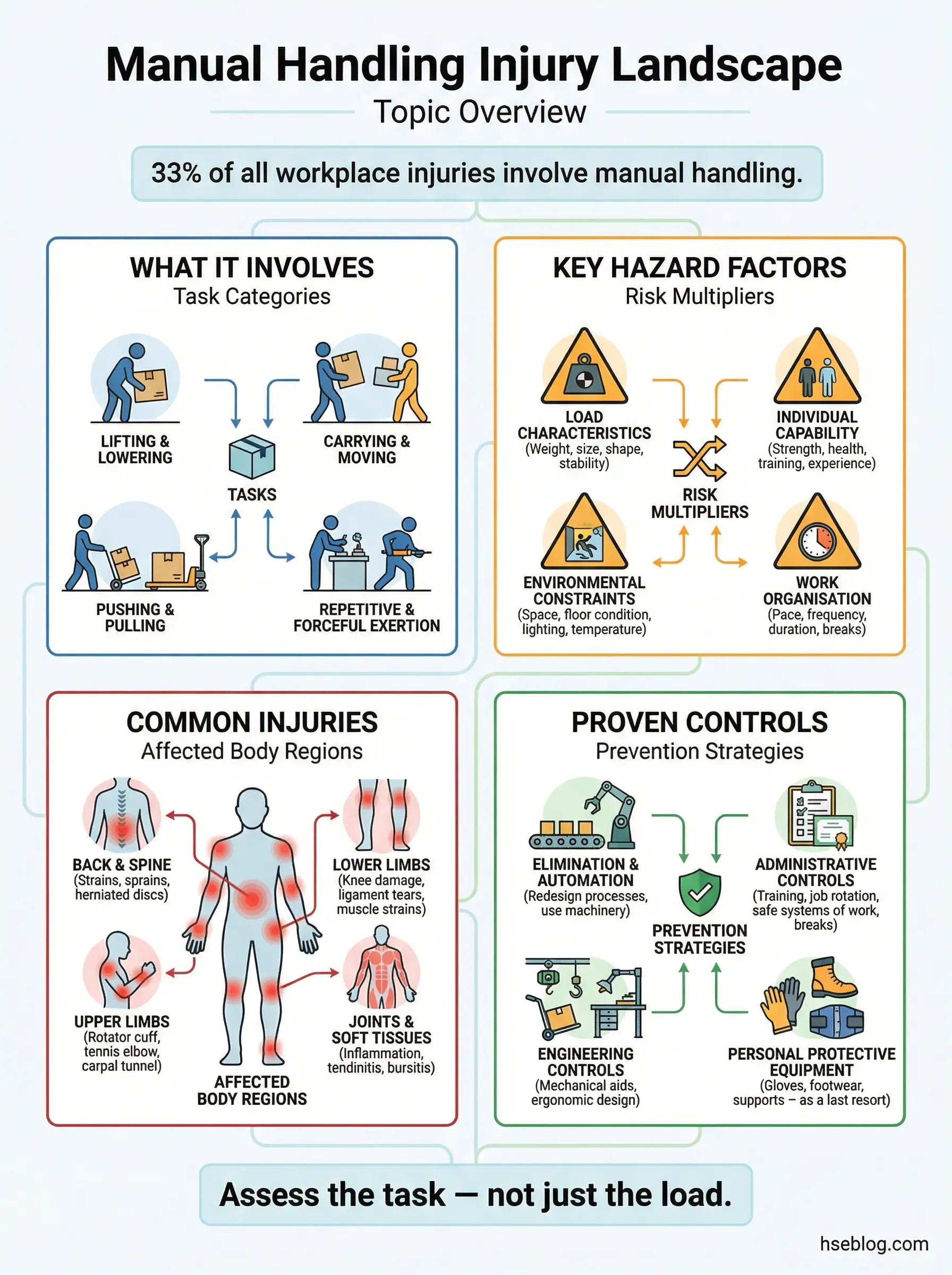 - Manual handling causes over one-third of all workplace injuries — and nearly every one is preventable with proper technique and task design
