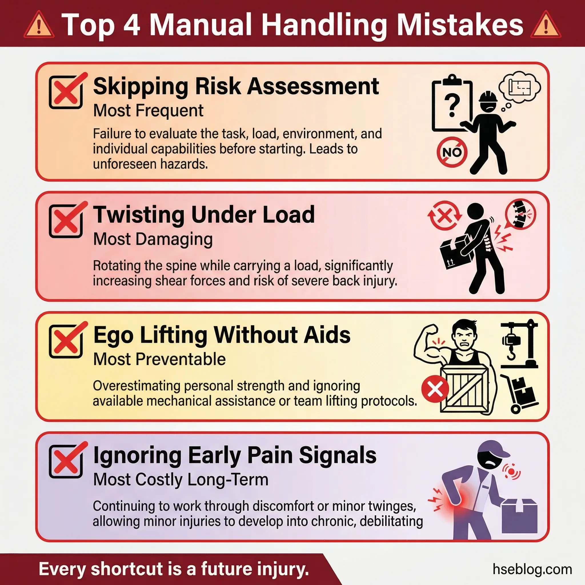 - Skipping the risk assessment — the most common failure; workers begin lifting without any consideration of load weight, path of travel, destination height, or their own physical condition