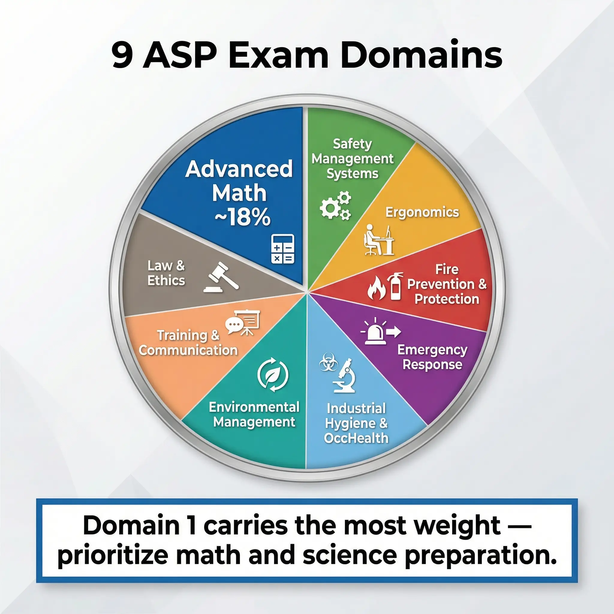 The ASP exam blueprint is divided into nine domains, each weighted differently. Understanding these domains is not just exam strategy — it maps directly to the knowledge areas you will use daily as a safety professional. The nine domains are: Advanced Sciences and Math, Safety Management Systems, Ergonomics, Fire Prevention and Protection, Emergency Response Management, Industrial Hygiene and Occupational Health, Environmental Management, Training Education and Communication, and Law and Ethics.
