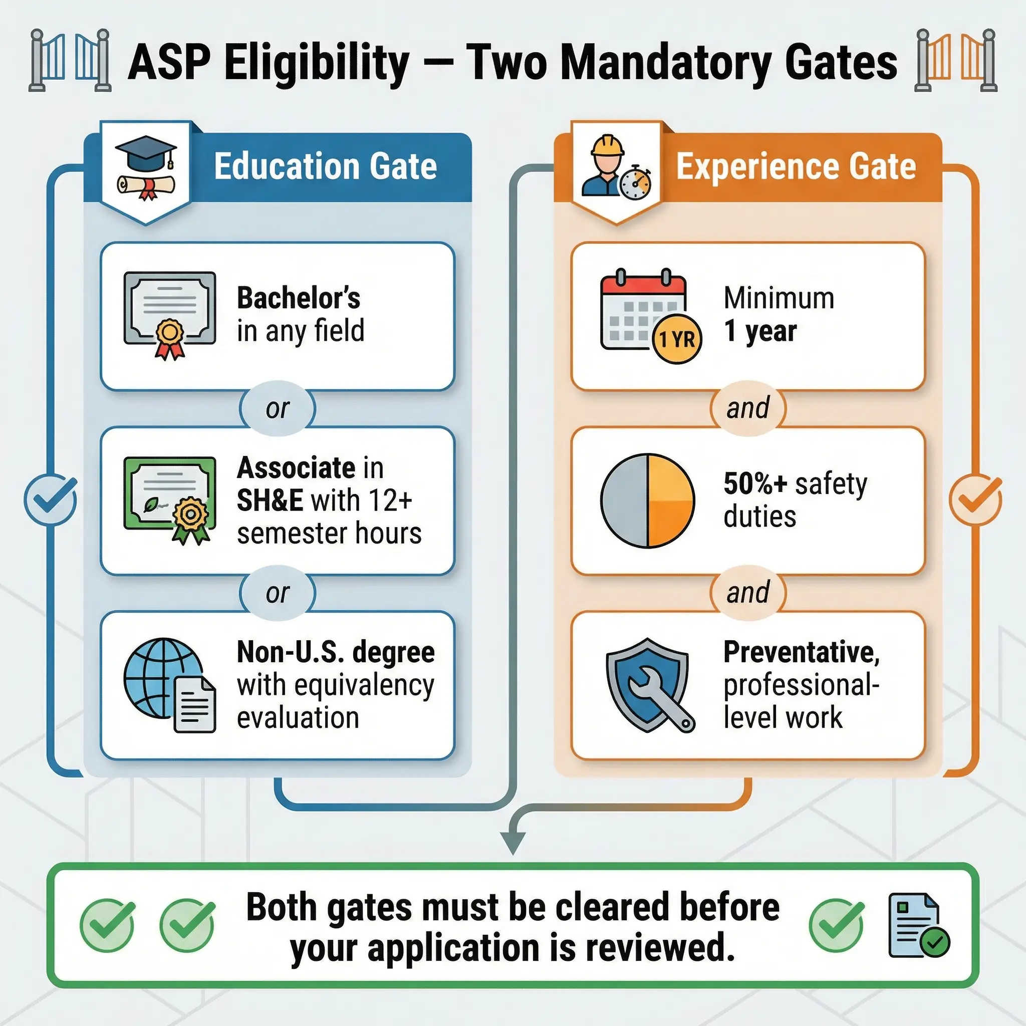 BCSP has defined clear eligibility gates for the ASP, and I have seen more candidates delayed by misunderstanding these requirements than by failing the exam itself. The two pillars are education and experience — both are mandatory, and both are verified.