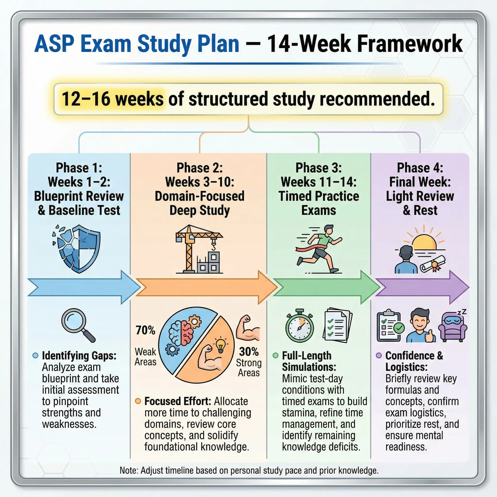- Third-party practice question banks — multiple providers offer 500–1,000+ practice questions aligned to the ASP blueprint. Use these to simulate exam conditions.