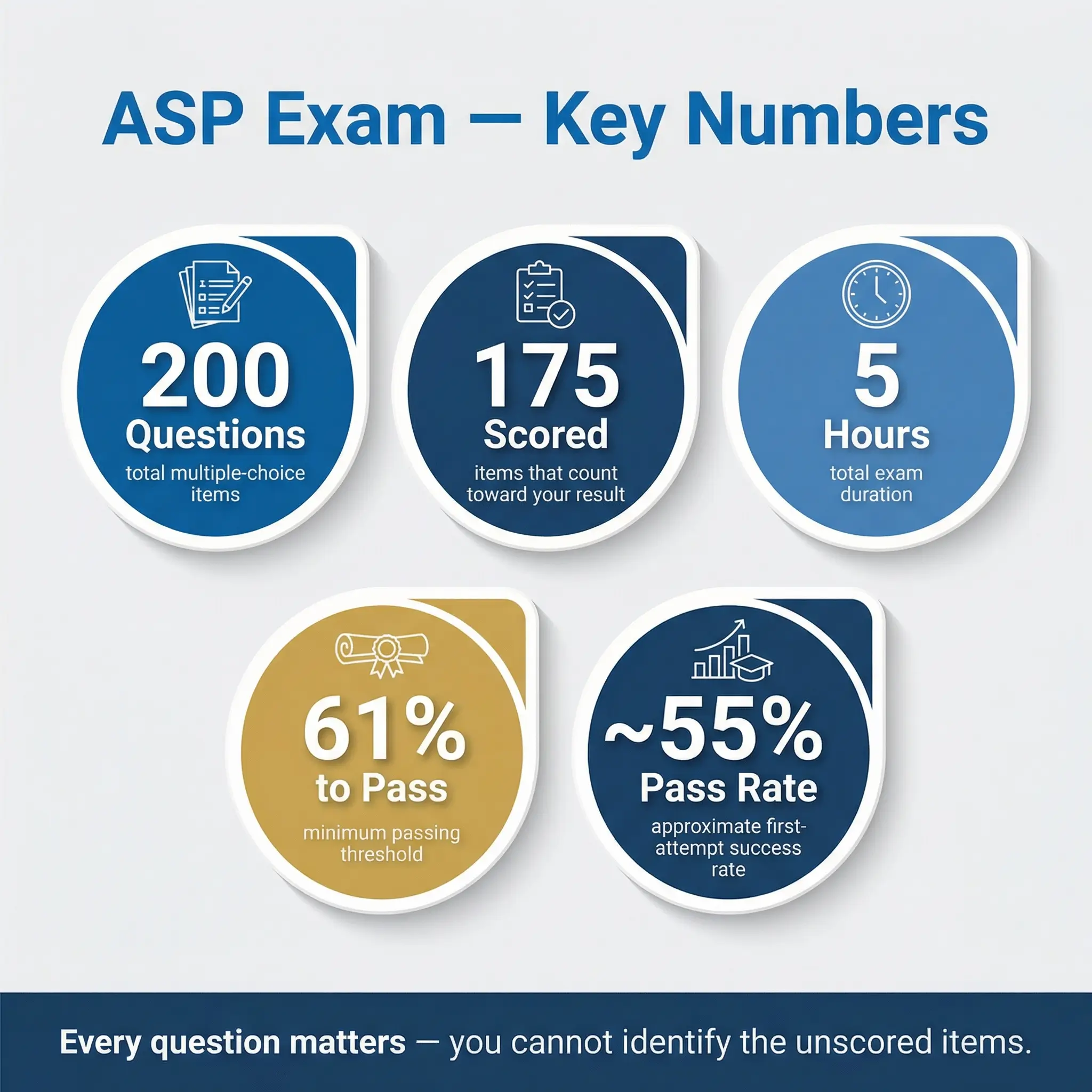 - 200 total questions — only 175 are scored. The 24 unscored questions on the ASP exam are called “beta” questions (some sources round to 25). These are embedded throughout the exam to evaluate new questions for future test versions. You cannot identify which questions are scored and which are not — so treat every question as if it counts.