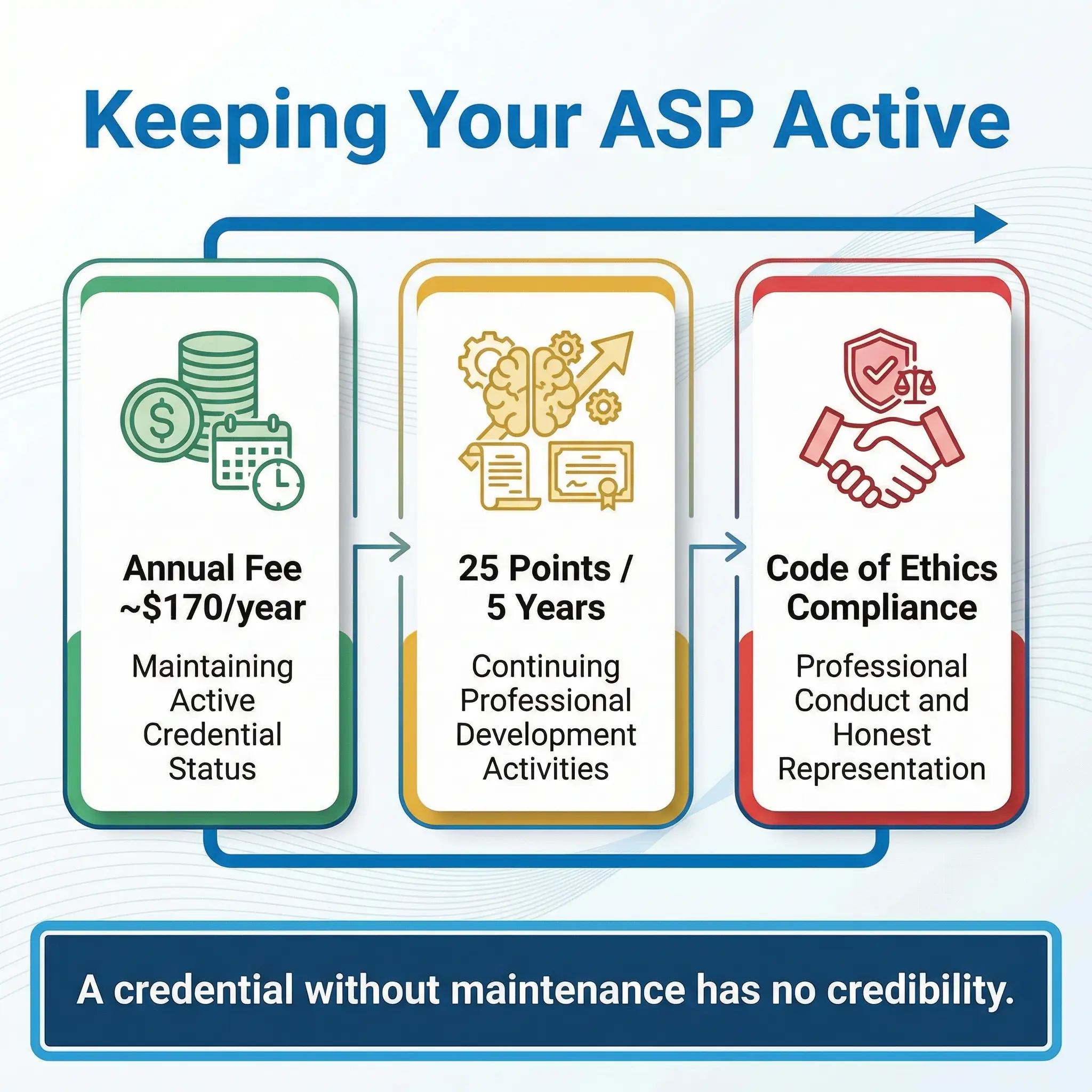 One important nuance: renewing the ASP is optional and up to the individual, and not renewing it will not affect the validity of a CSP certification if you have already advanced. Most professionals who earn the CSP let the ASP lapse, since the CSP encompasses and supersedes it.