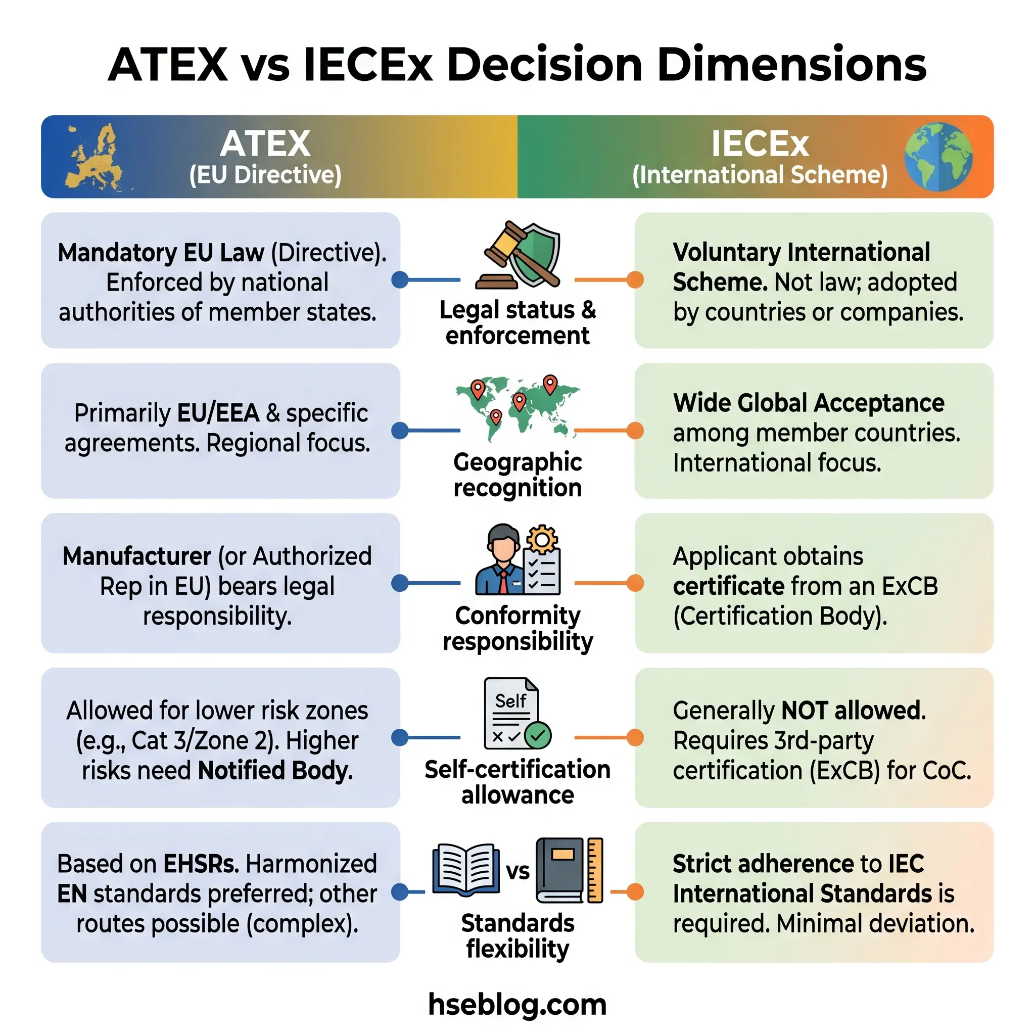 The single most important distinction to internalize is this: ATEX is a legal requirement enforced by EU member states; IECEx is a voluntary certification accepted by participating countries. Everything else — from how certificates are issued to who bears conformity responsibility — flows from that fundamental difference.