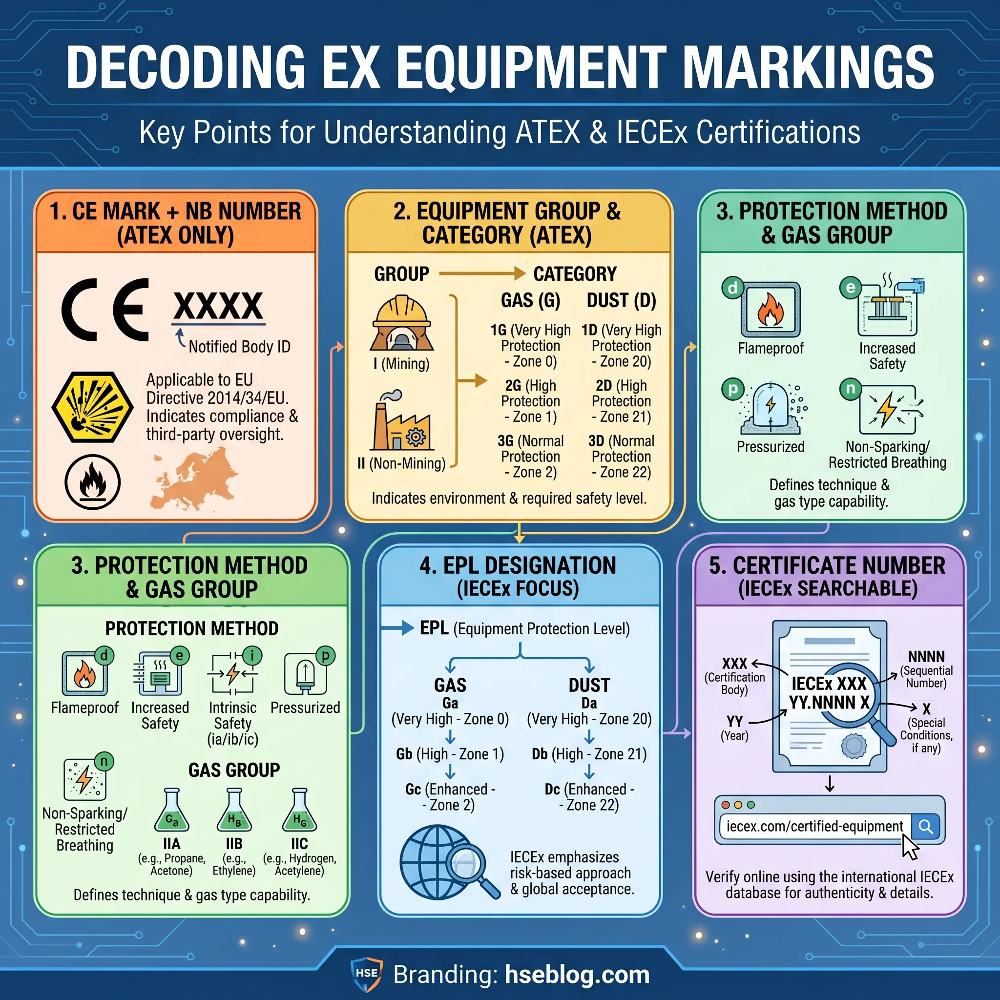 During a recent equipment verification exercise for an offshore gas processing module, I walked a junior engineer through decoding seventeen different nameplates. The marking that confused him most was a dual-certified product carrying both ATEX and IECEx information on the same label. Once he understood that the ATEX portion communicates with EU regulators and the IECEx portion communicates with the global certification database, the logic clicked.