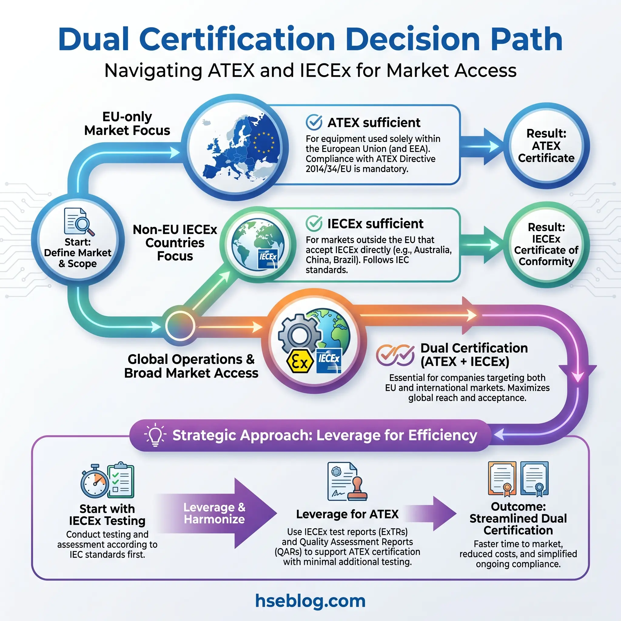 The decision framework reduces to three scenarios. Products sold exclusively within Europe need only ATEX. Products destined solely for IECEx-accepting countries outside Europe need only IECEx. Products serving global markets — or products whose end-market is uncertain at the design stage — benefit most from dual certification pursued from the outset.