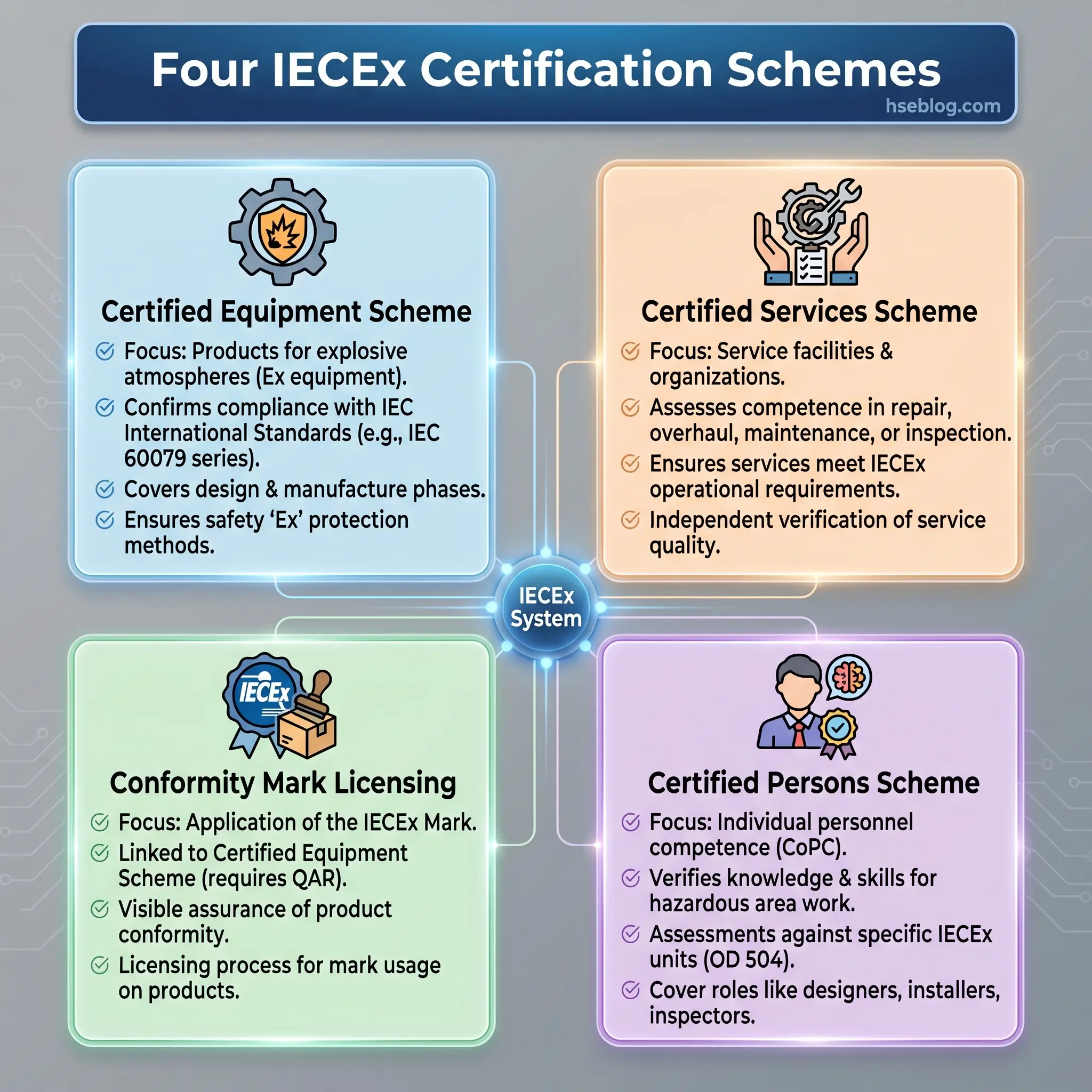 What distinguishes IECEx from most certification frameworks is its breadth across four distinct schemes. The Certified Equipment Scheme handles product conformity. The Certified Services Scheme covers repair, overhaul, and installation work on Ex equipment. The Conformity Mark Licensing System provides a unified product mark. And the Certified Persons Scheme verifies competence of individuals working on Ex equipment. No competitor consistently highlights this fourfold structure, but it matters: IECEx is not just about equipment — it is about the entire competency chain surrounding explosive atmosphere safety.