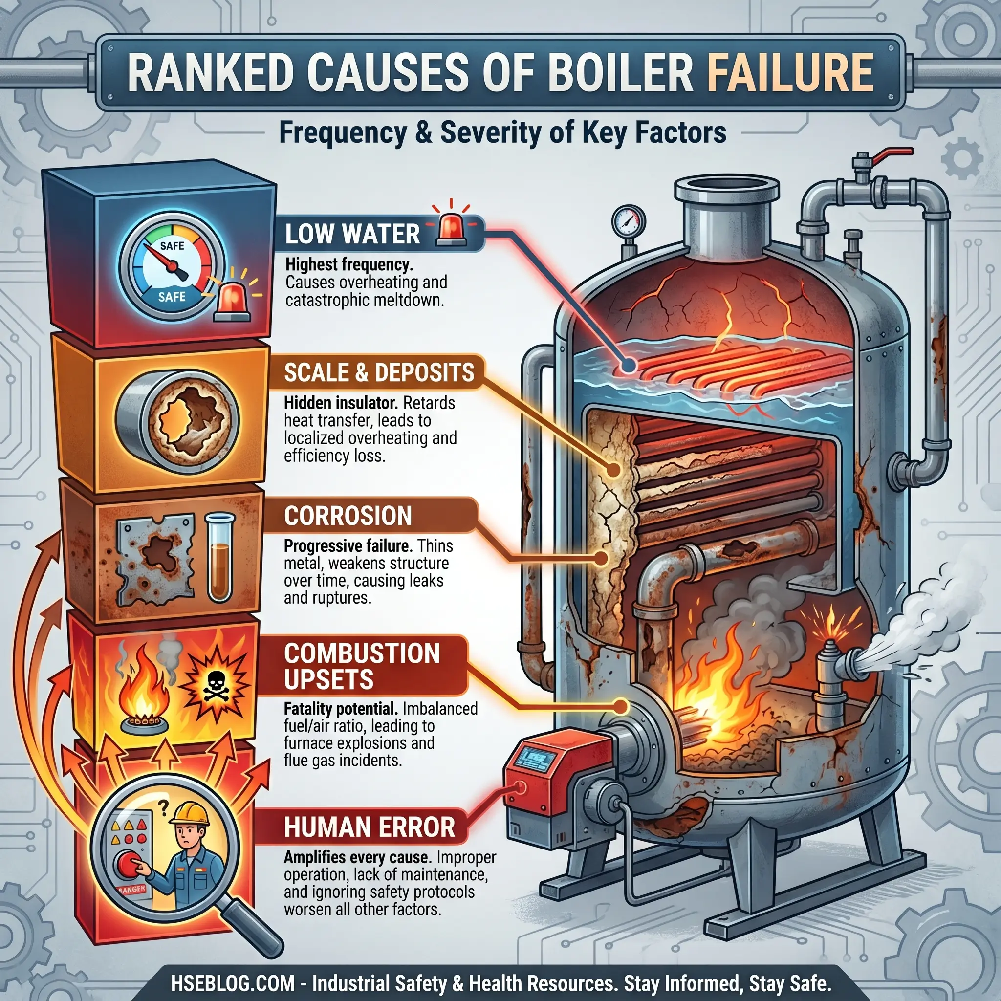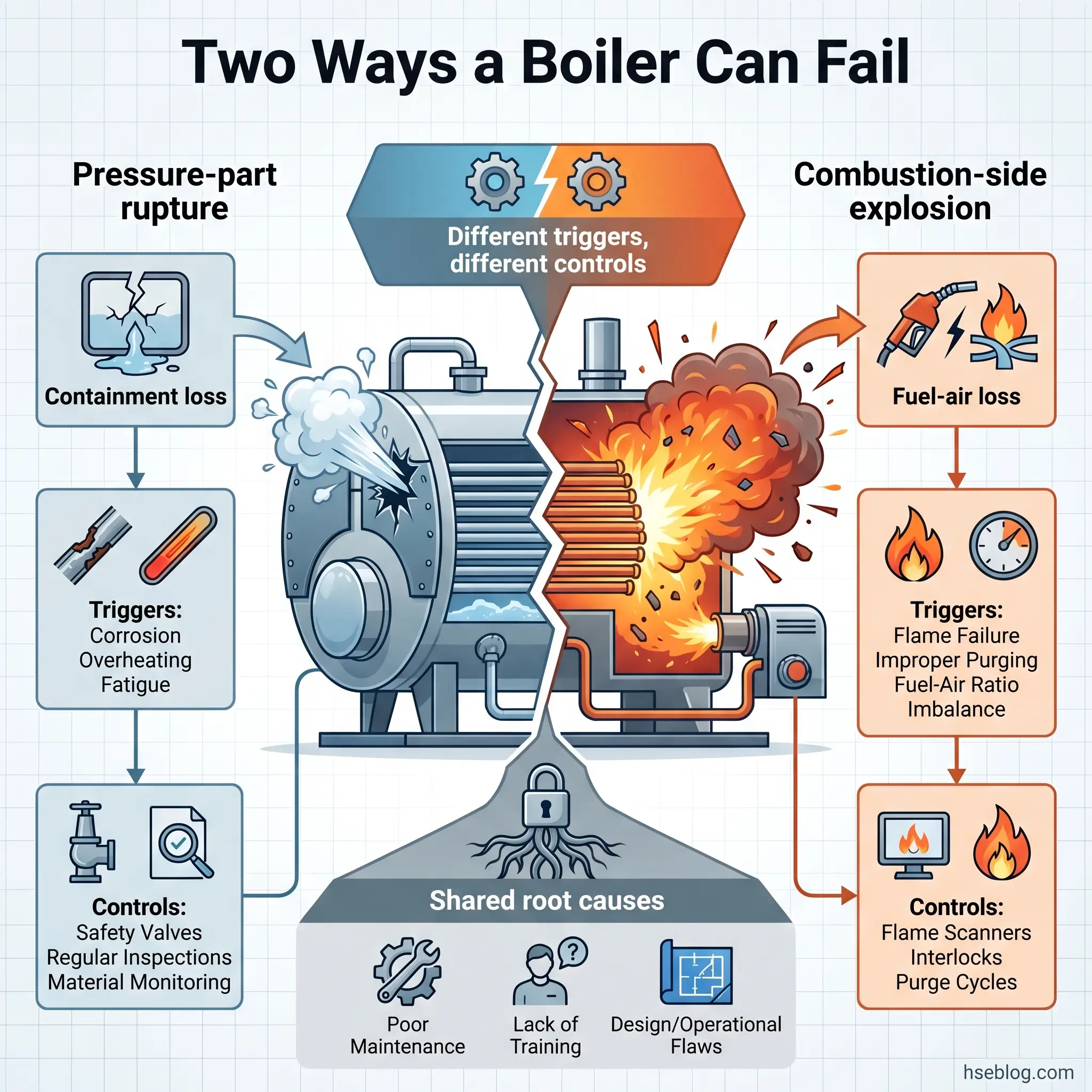 The same root cause can trigger either mode. Poor maintenance can allow a tube to fail from scale overheating (pressure-part mode) or let a burner management interlock degrade until a fuel-rich start-up ignites the furnace (combustion mode). Knowing which mode you are defending against in any given scenario determines which controls matter.