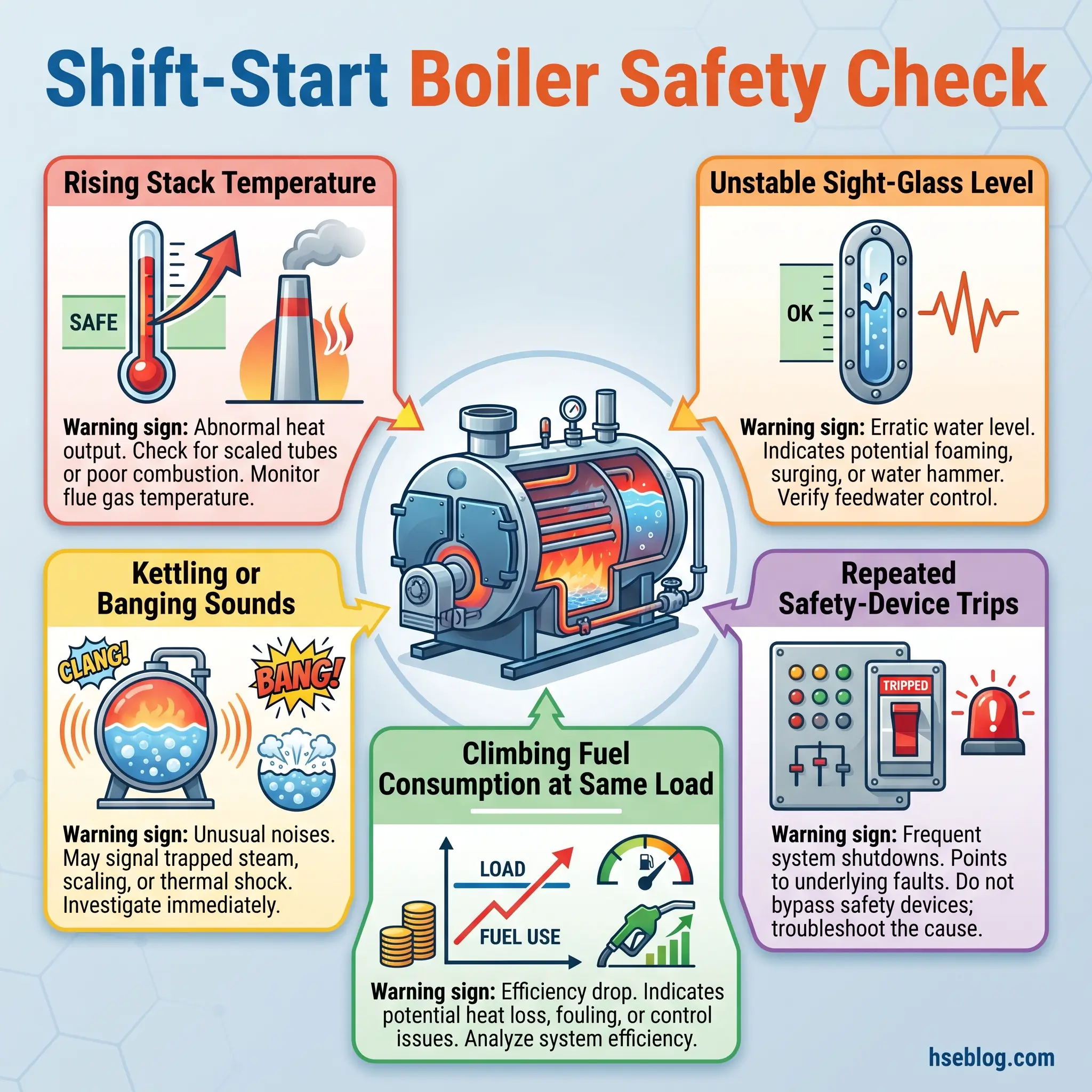 Most boiler incidents do not happen without warning. They happen when the warning signs are observed but not acted on, or when no one on the shift was trained to recognise them for what they are. The list below is what a competent operator checks in the first ten minutes of every shift — and what an HSE officer watches for during a plant walk.
