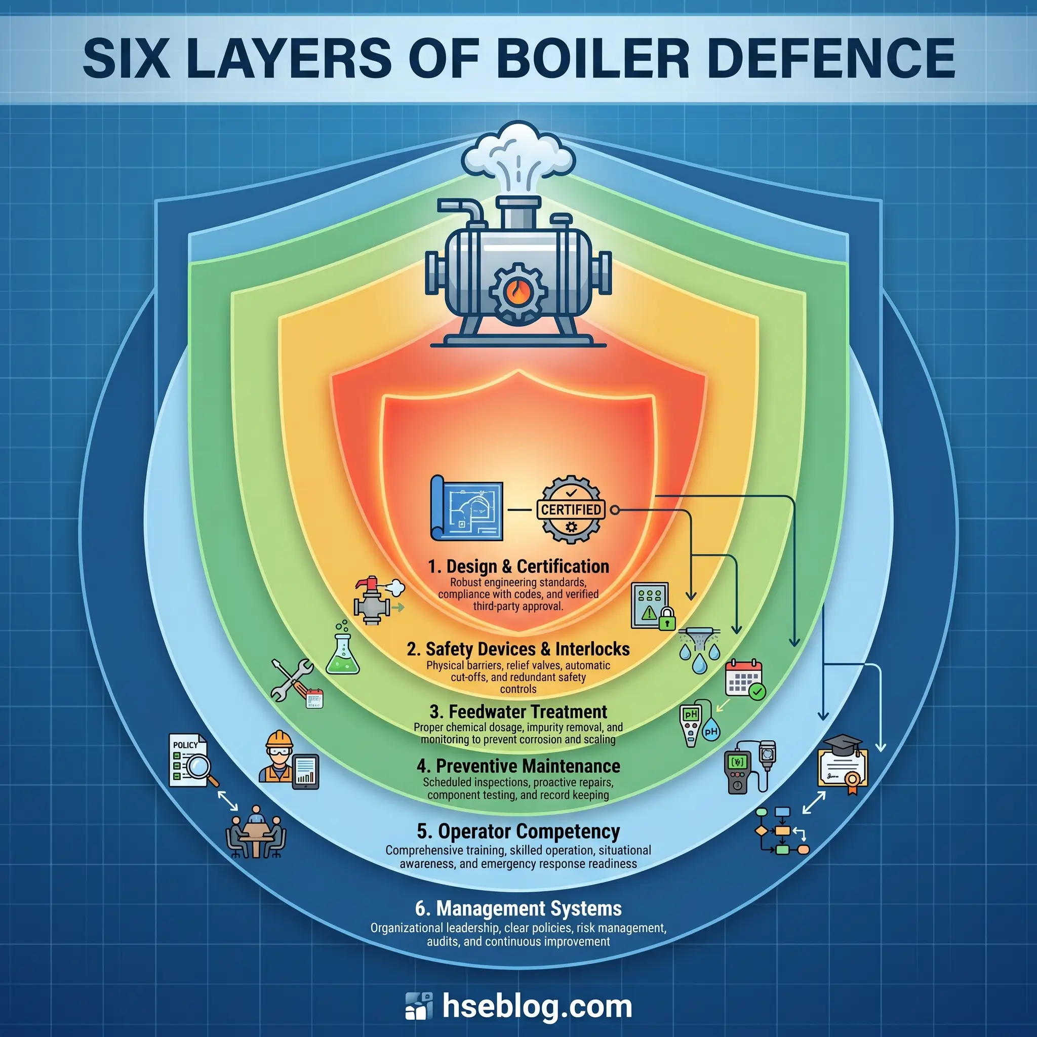 Boiler safety is not one defence. It is six. Each layer covers a specific family of failure modes, and each layer has to hold independently — because a boiler incident is almost always the result of more than one barrier having already failed.