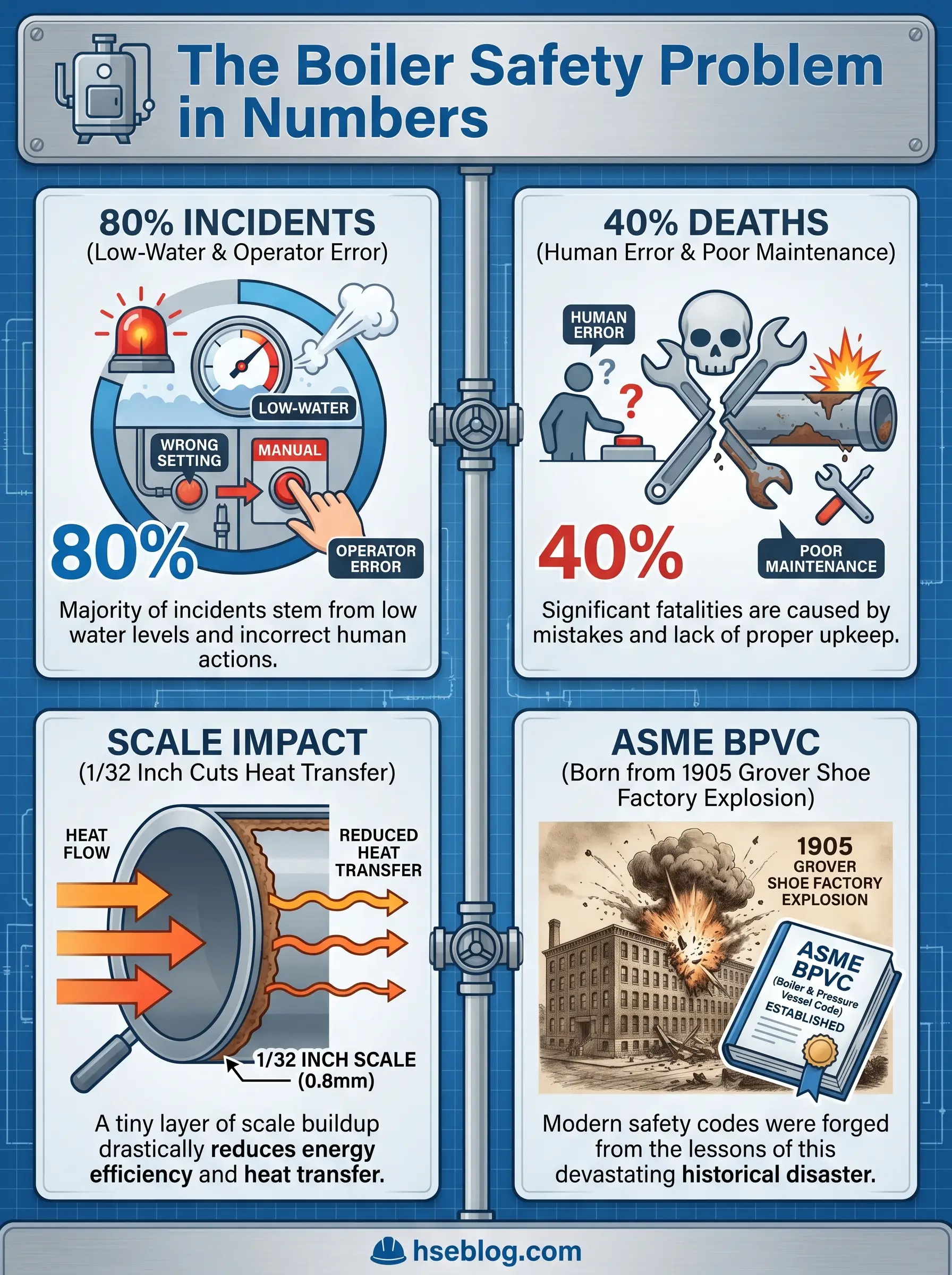 The consequences of releasing that energy uncontrolled are not theoretical. Boiler explosions have killed crews, levelled buildings, and shut plants down for months. What makes the incident pattern harder to accept is the cause distribution: National Board of Boiler and Pressure Vessel Inspectors data shows that roughly 80% of reported industrial boiler accidents trace back to low-water condition and operator error — two failure modes that can be engineered and managed out. This guide walks through why boilers fail, the early warning signs that precede most incidents, the regulatory framework that governs boiler safety, and the layered prevention approach that keeps pressure vessels inside their design envelope. The scope is industrial and commercial steam and hot water boilers, not domestic appliances.