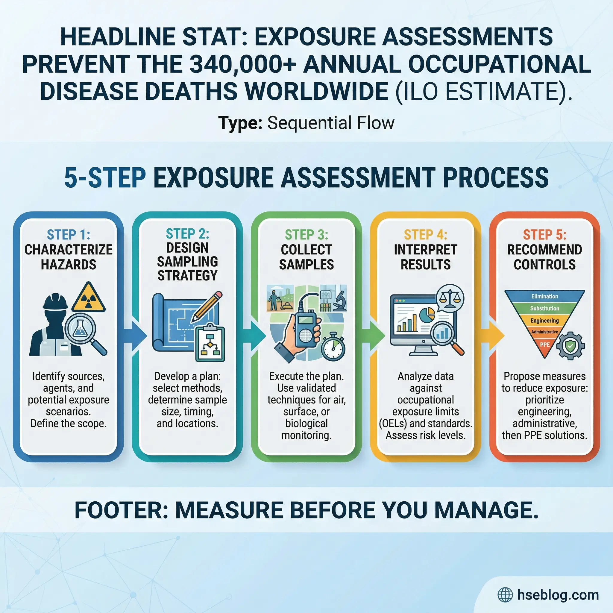 - Characterize the exposure scenario: Identify the chemical agents, physical agents, or biological agents present and the tasks that generate exposure