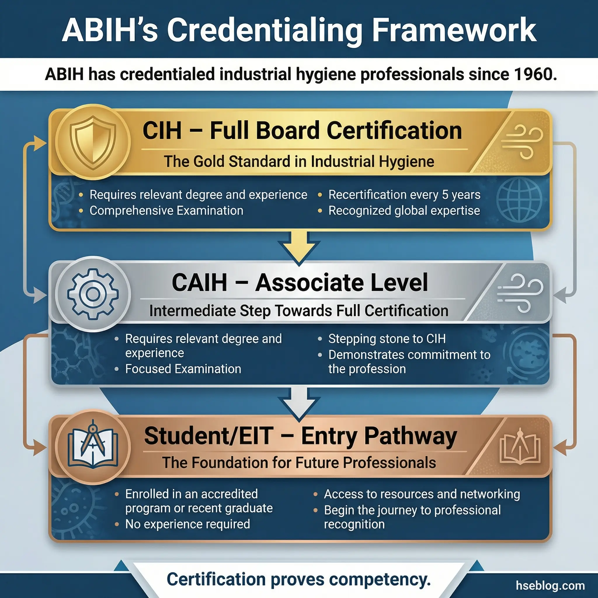 | CAIH (Certified Associate IH) | Industrial Hygiene (entry-level) | ABIH | Foundation-level IH practice under supervision of a CIH |