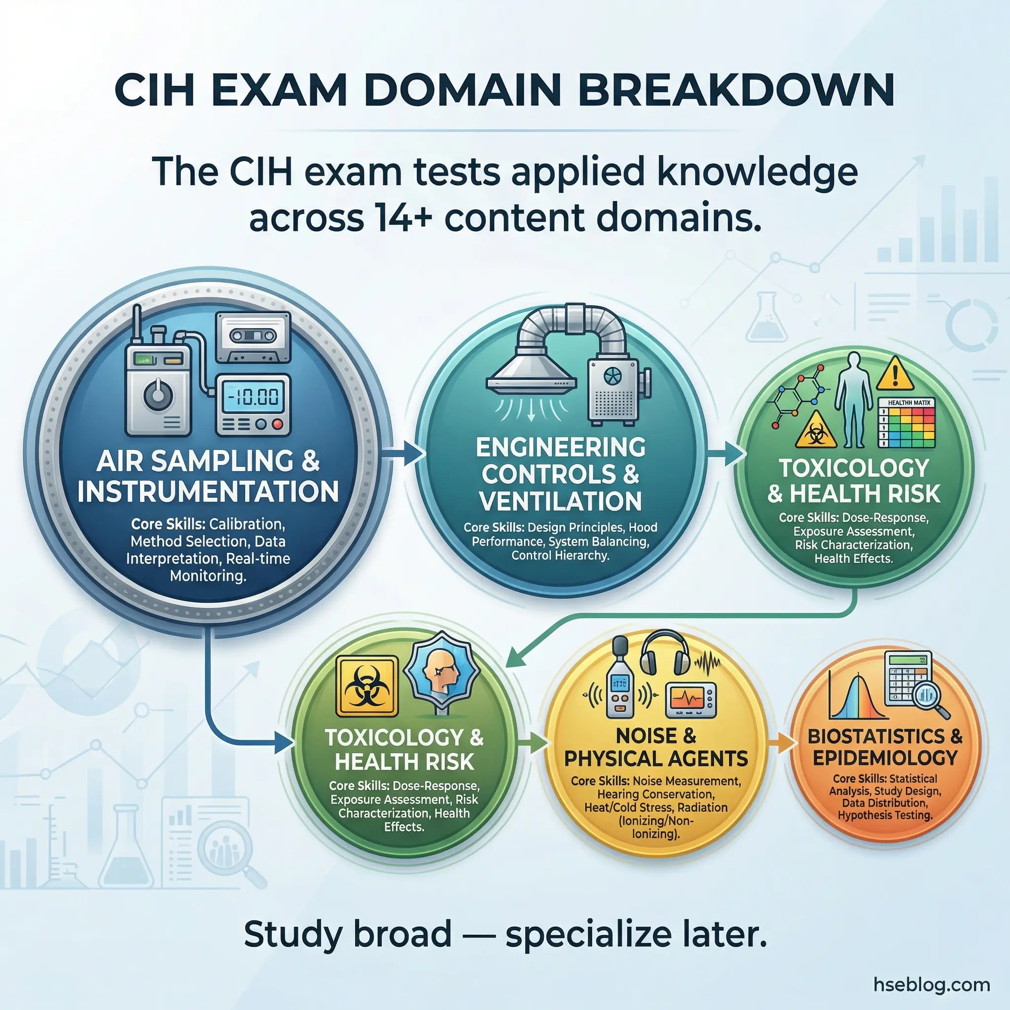 The CIH exam tests knowledge across defined content domains that reflect the breadth of industrial hygiene practice. Each domain carries a weighted percentage of the total exam, and candidates must demonstrate competency across all areas — not just their specialty.
