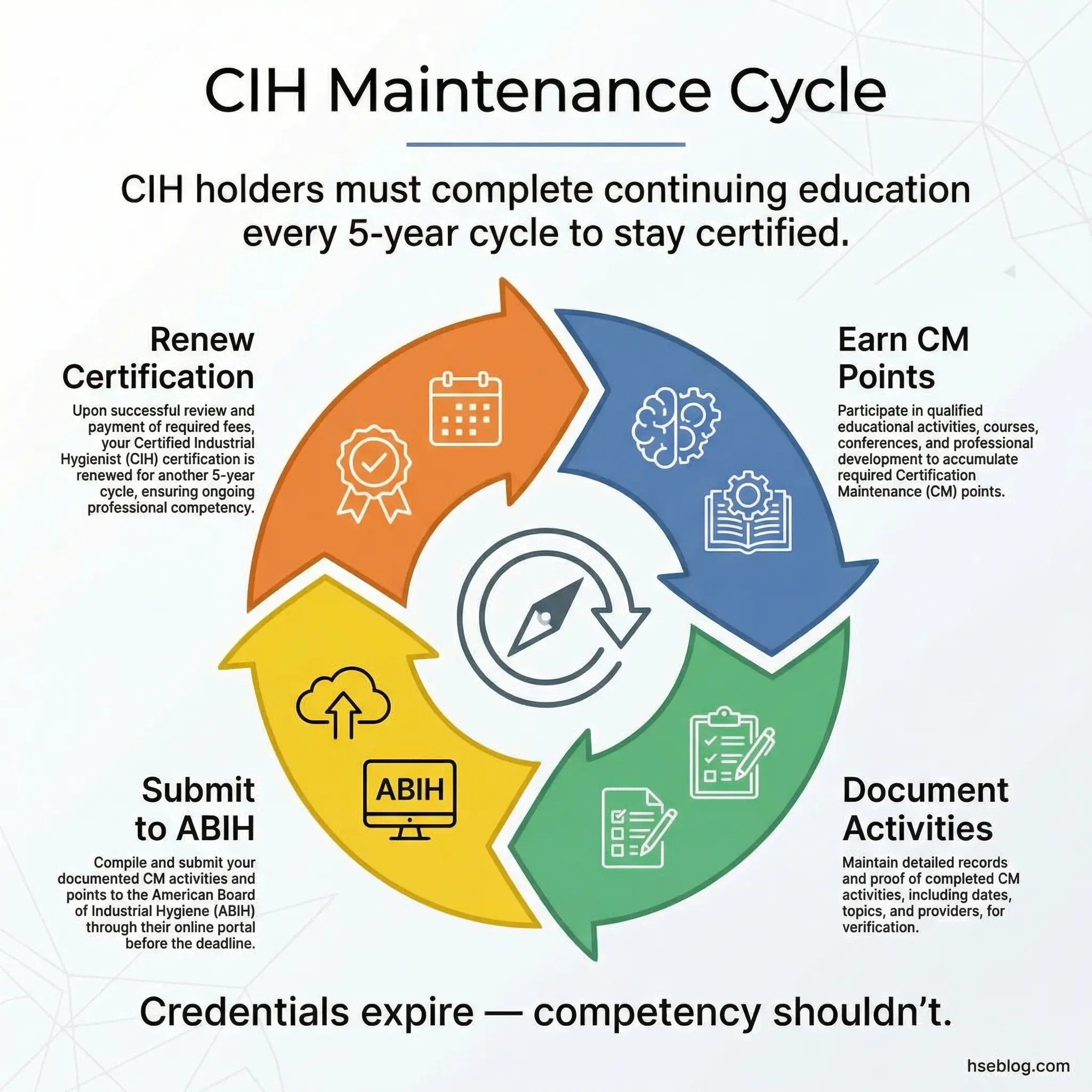| “Once certified, the CIH never expires” | CIH certification requires active maintenance through continuing education points during each five-year cycle — lapsed certifications become inactive |