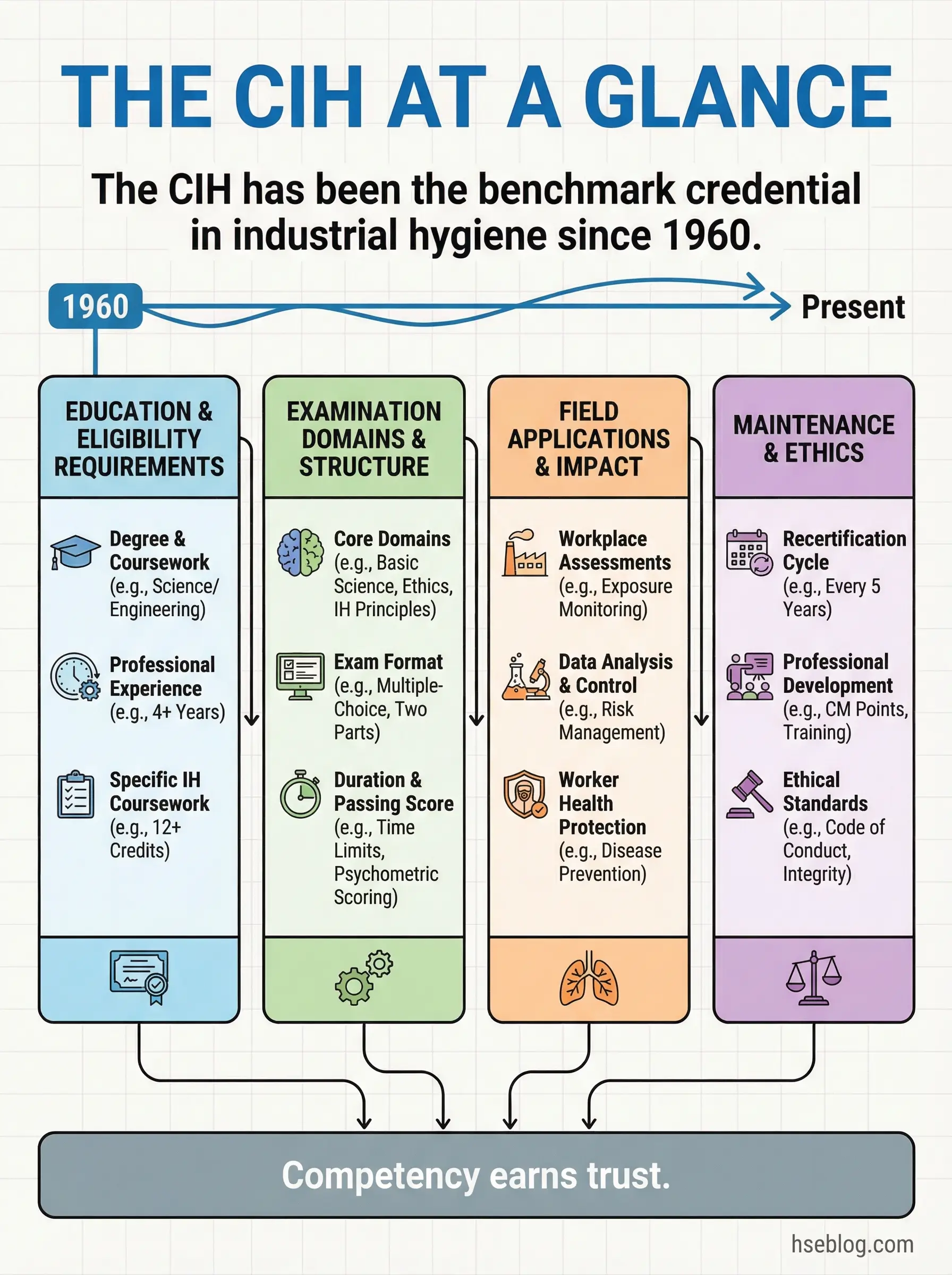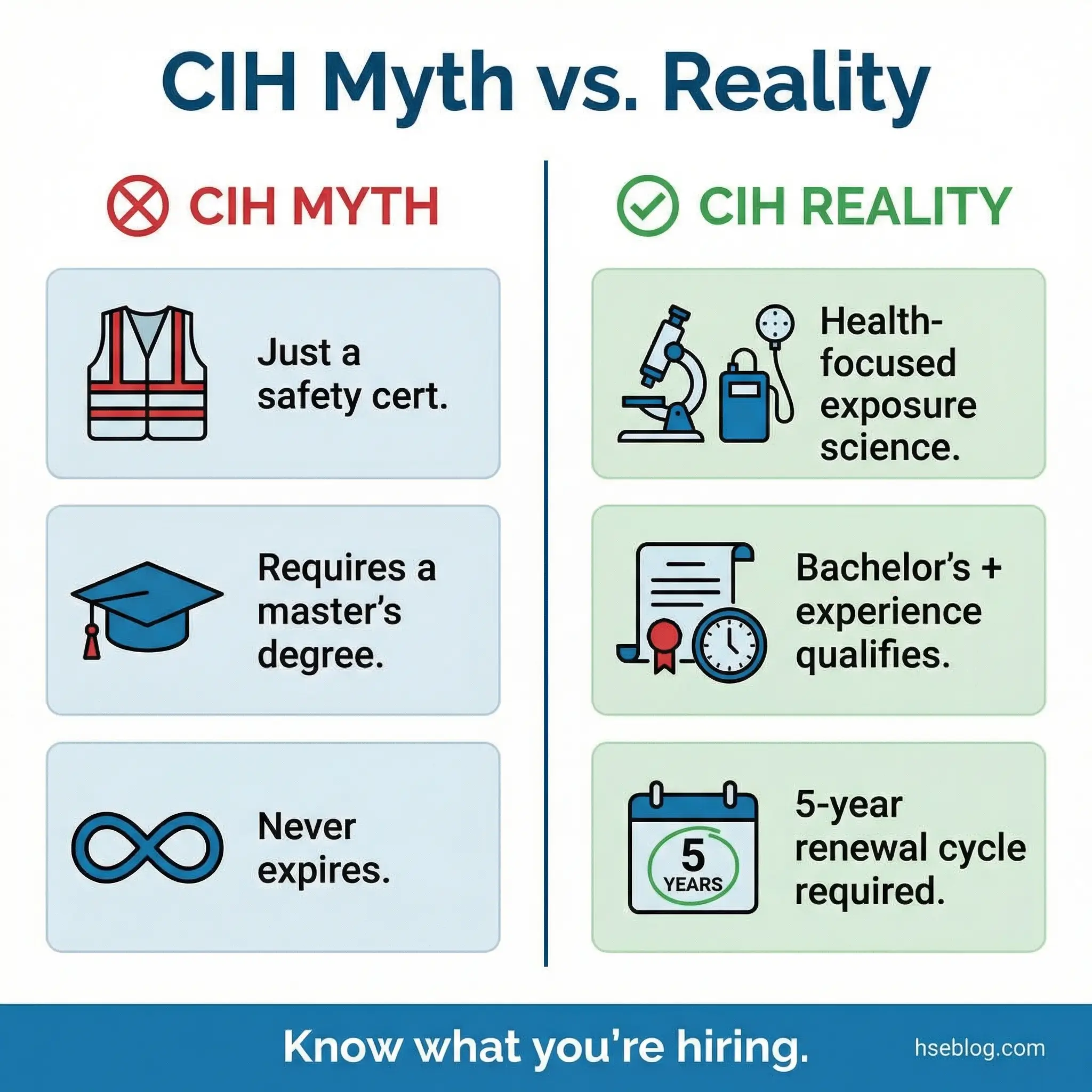 | “CIH is just another safety certification” | The CIH is specifically an occupational health credential focused on disease prevention through exposure science — it does not cover safety management, accident investigation, or injury prevention |