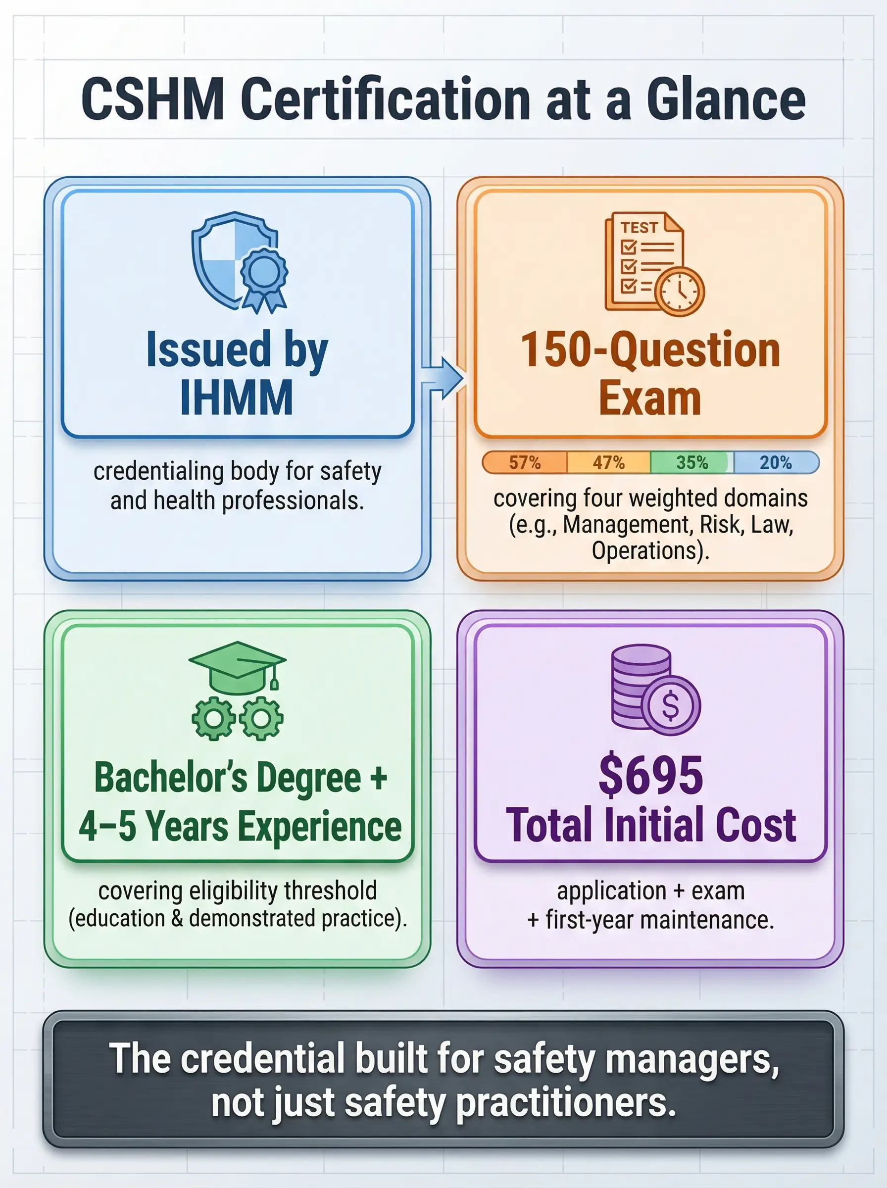 The Certified Safety and Health Manager (CSHM) is a professional credential issued by the Institute of Hazardous Materials Management (IHMM) that recognizes EHS professionals who possess both occupational safety and health expertise and demonstrated competence in business and financial management principles. It is the only accredited safety certification that explicitly integrates general management, leadership, quality systems, and financial decision-making into its examination scope alongside traditional safety and health technical knowledge.