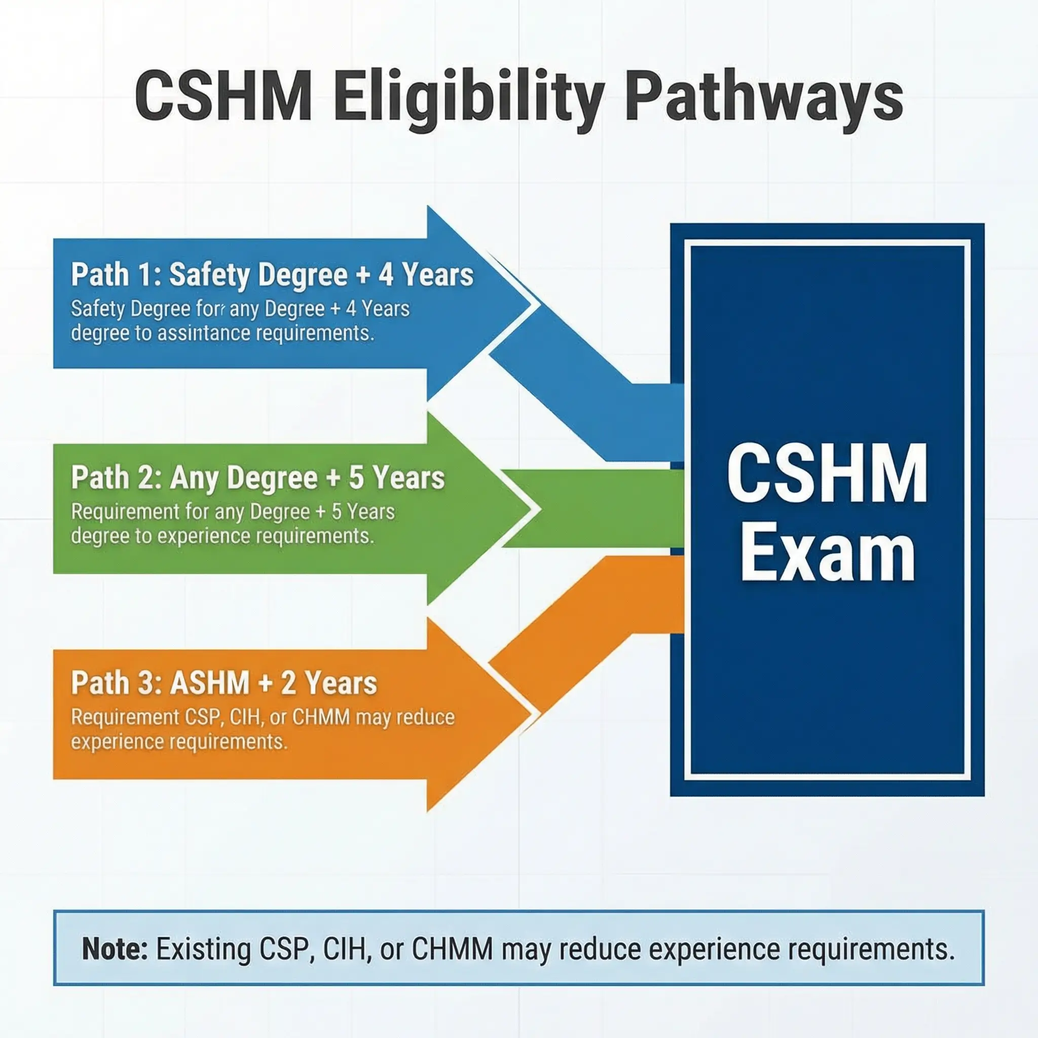 Holding certain existing professional certifications can reduce or eliminate the experience requirement entirely. If you already hold a Certified Safety Professional (CSP), Certified Industrial Hygienist (CIH), Certified Hazardous Materials Manager (CHMM), or Canadian Registered Safety Professional (CRSP), these recognized credentials can streamline your path to CSHM eligibility. This is worth investigating before you assume you need additional years of documented experience.