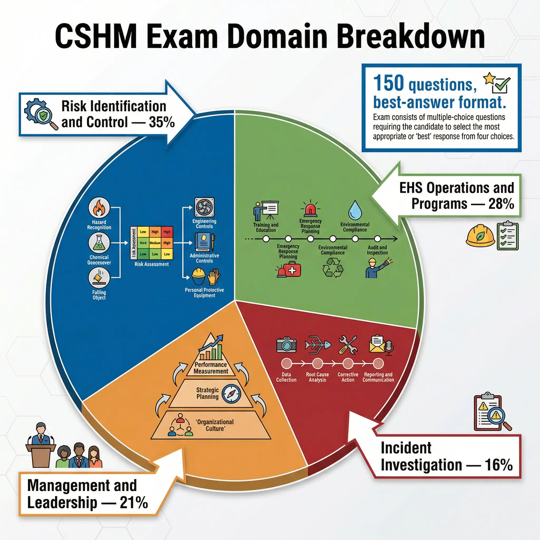 The CSHM examination is a 150-question, multiple-choice test structured around four weighted content domains. Every question requires selecting the “best” answer — not merely a correct answer, but the most appropriate response for a given management scenario. This format is deliberate. It reflects the kind of judgment-based decision-making that safety managers face daily, where multiple options might be defensible but one is clearly superior.