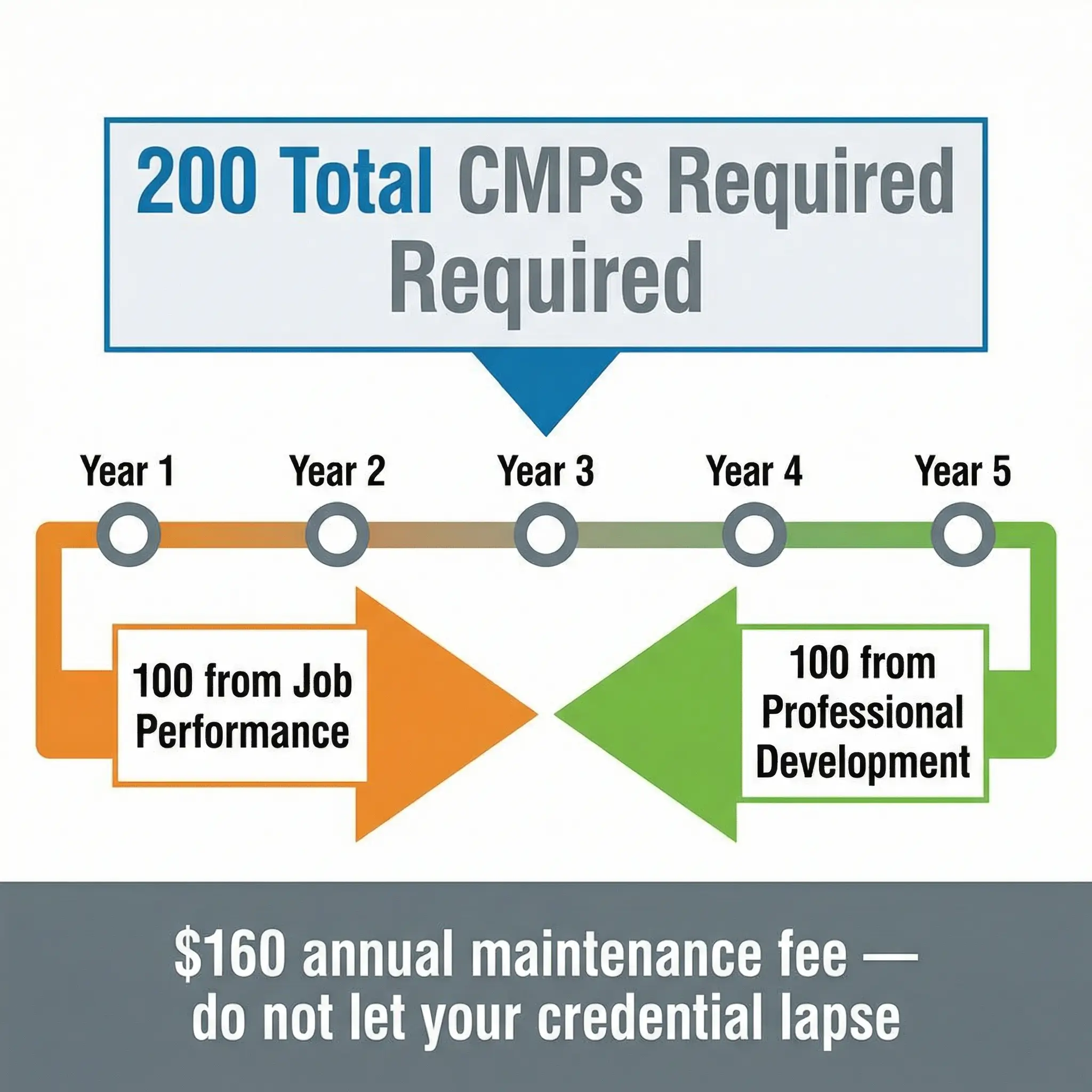 - Recertification costs add up over time: At $160 per year in maintenance fees, you will spend $800 over each five-year cycle just to keep the credential active — before factoring in the cost of earning your required 100 professional development CMPs. That ongoing investment needs to generate measurable career returns to justify itself.