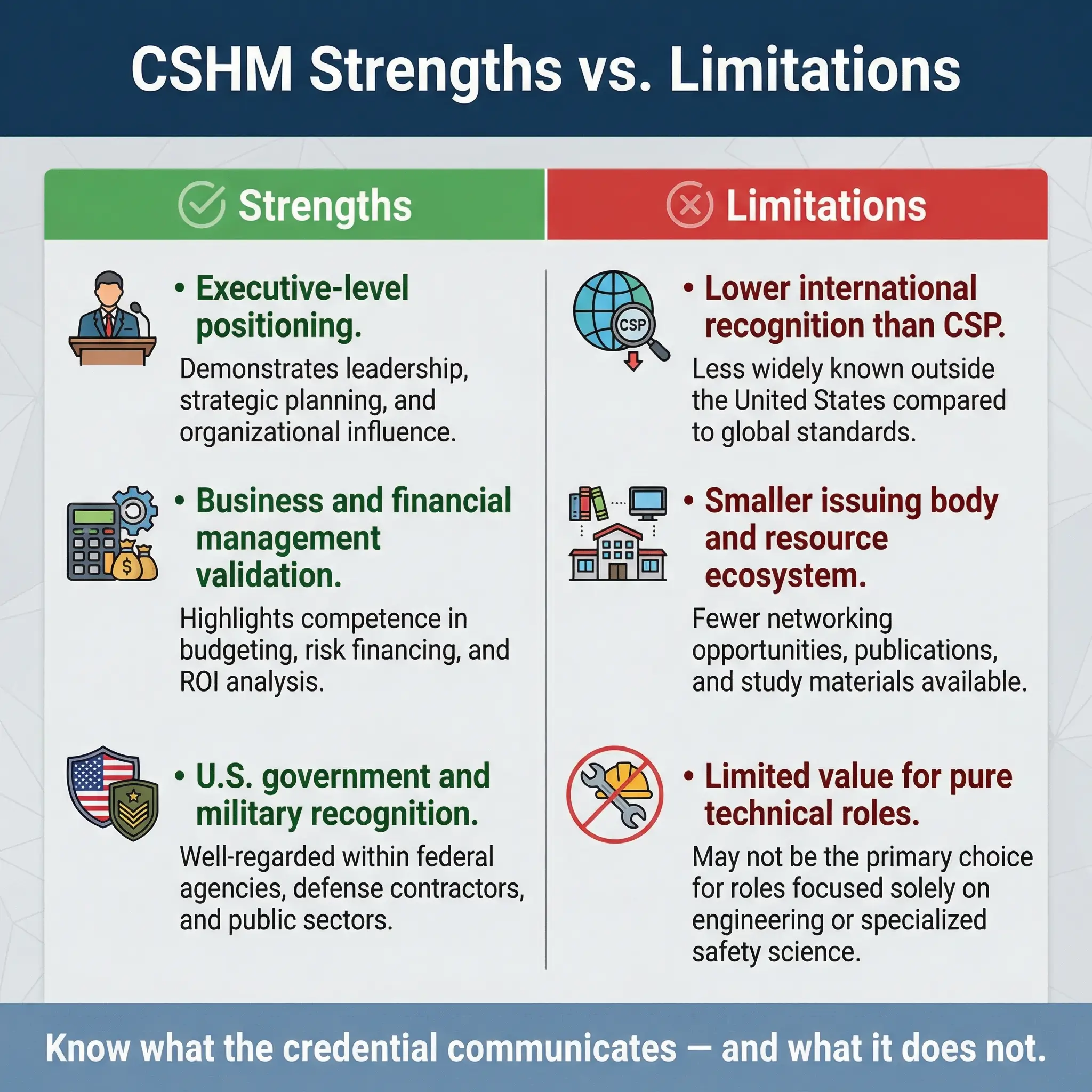 No credential is perfect, and an article that only lists benefits is not giving you the full picture. After working in environments where the CSHM, CSP, NEBOSH, and various ISO lead auditor certifications all circulate, I can identify specific areas where the CSHM has limitations you should weigh before committing.
