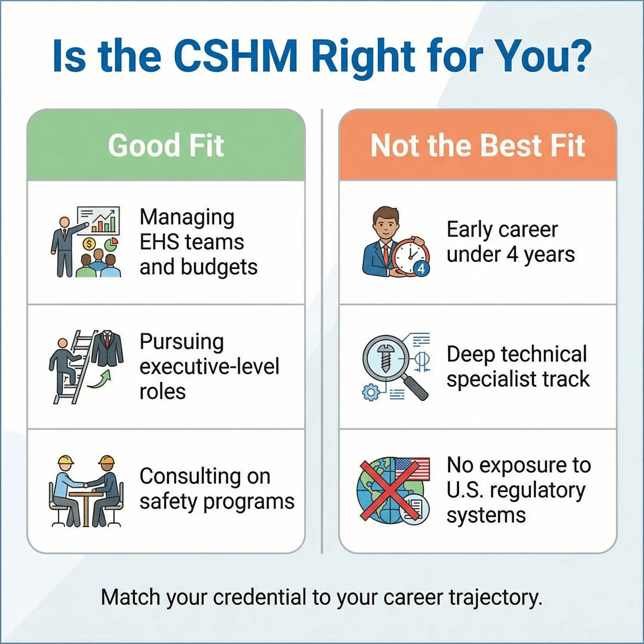 - Technical specialists focused on industrial hygiene, ergonomics, or environmental science — the CSHM does not go deep enough into any single technical domain to validate specialist expertise. The CIH, QEP, or CHMM would serve you better.