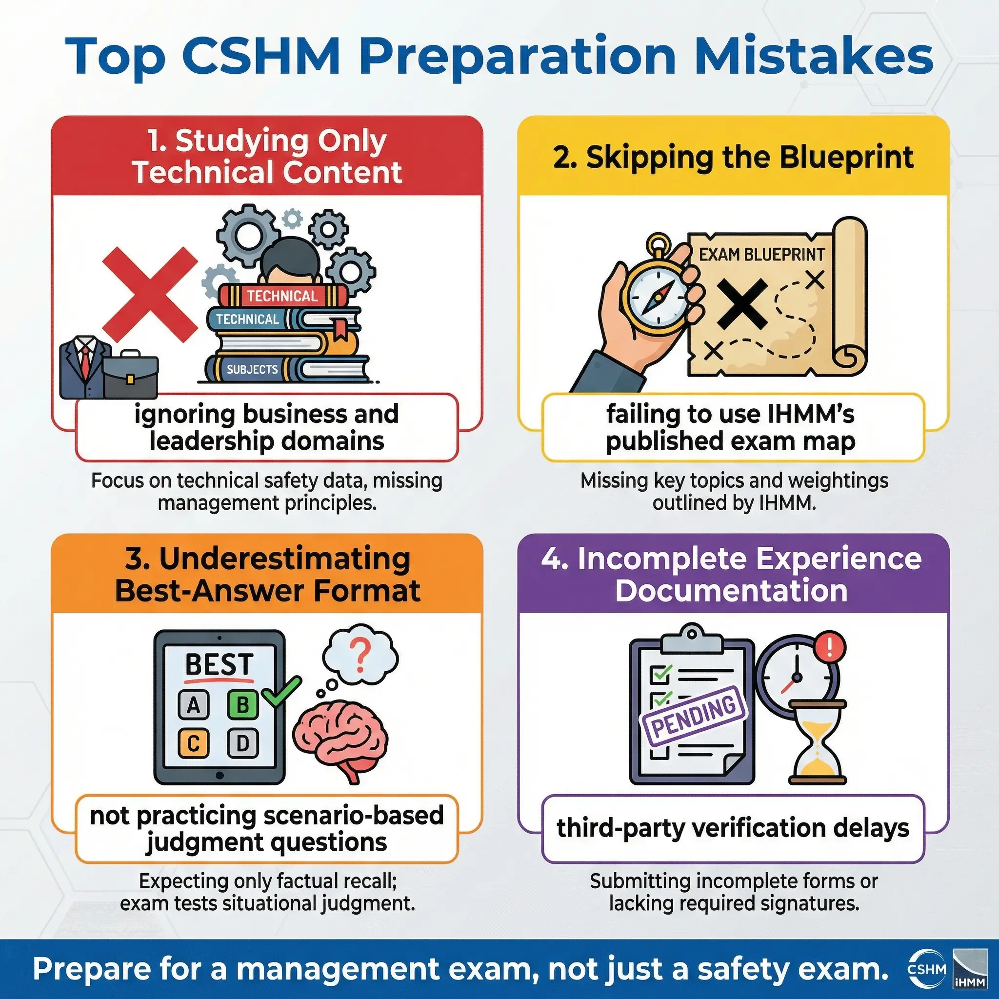 Over the years, I have mentored several professionals through the CSHM process and watched the same mistakes repeat. Most of these errors happen before the candidate even sits for the exam.