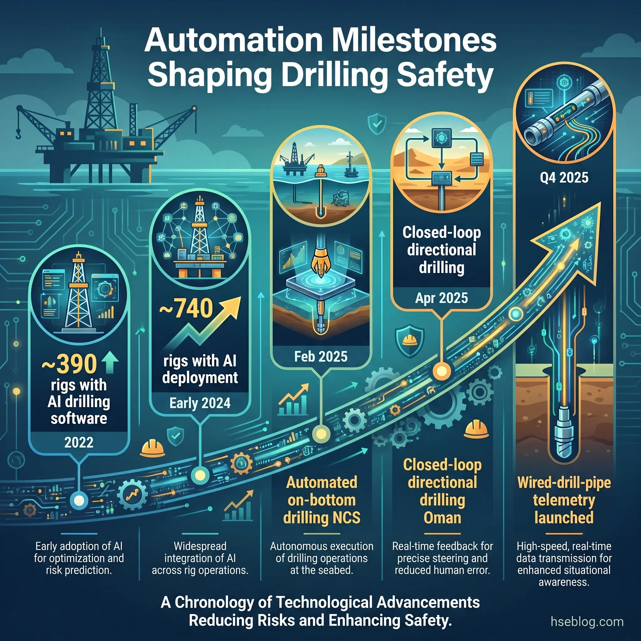 The 2025 deployments that matter for safety are concrete, not conceptual. In February 2025, the Halliburton and Sekal integration of LOGIX with Drilltronics delivered automated on-bottom drilling on the Norwegian Continental Shelf — closed-loop control of weight on bit, rotary speed, and flow rate with human oversight from onshore. In April 2025, Halliburton and Nabors deployed fully automated rotary and slide drilling in Oman, integrating surface and subsurface automation for the full directional drilling cycle. In Q4 2025, Halliburton launched StreamStar wired-drill-pipe telemetry, providing high-bandwidth real-time data from downhole to surface in a production-deployed form.