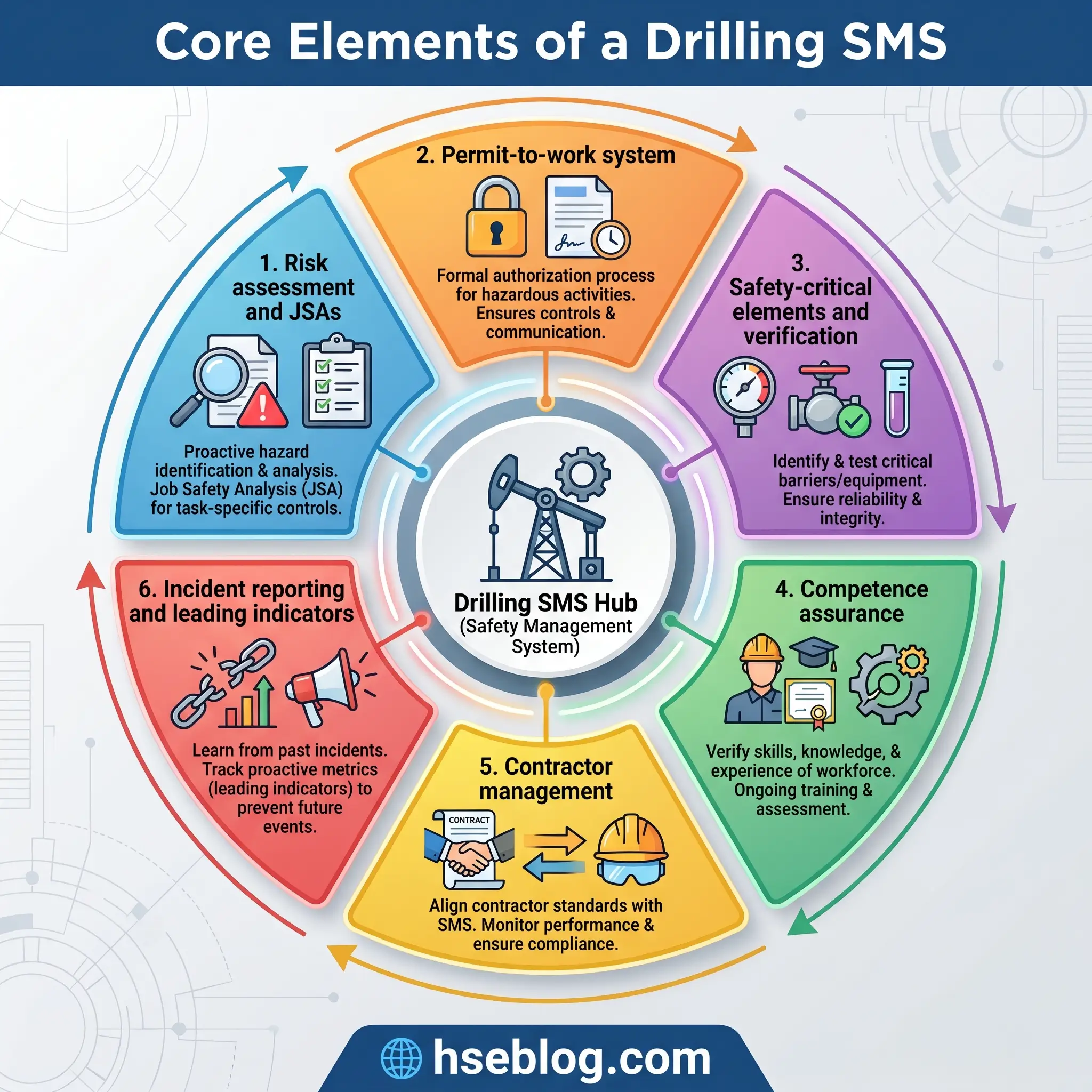 All of this hazard-by-hazard control work collapses without an integrated management framework binding it together. A drilling rig runs hundreds of work activities across a 24-hour day, and no site manages that through individual hazard controls alone. The discipline is built into a safety management system (SMS) with a few core elements that every competent operator shares.