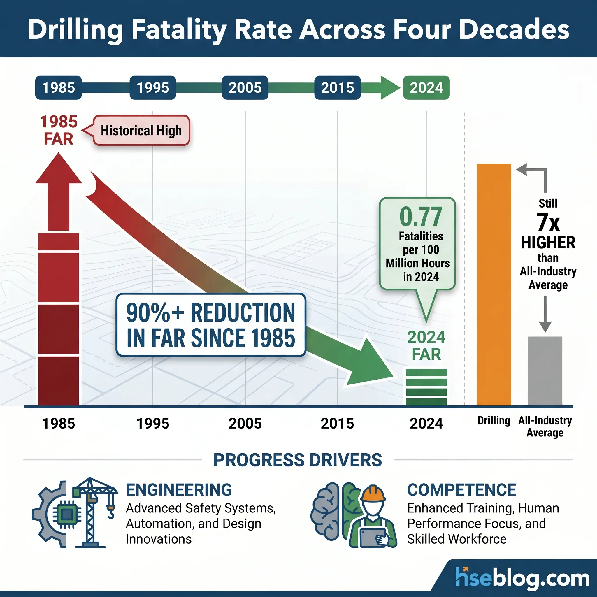 The long-view numbers are genuinely encouraging. IOGP data shows the fatal accident rate has fallen by over 90% since 1985, and 2024’s 0.77 per 100 million hours is the continuation of a multi-decade downward trend driven by engineering controls, competence frameworks, and management-system maturity. The gap to zero is real — 32 fatalities across one year of reporting is 32 too many — but the industry that produced those numbers is the same industry that has pulled them down by an order of magnitude in thirty years. The work is learnable, and the direction is correct.