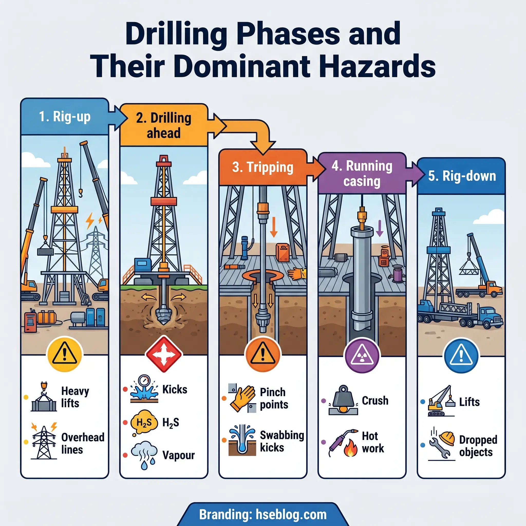 The drilling lifecycle layers another dimension on top. During rig-up, the dominant hazards are heavy lifts, overhead-line clearance, and struck-by injuries from mast raising — well-control risk is essentially zero because no hole exists yet. During drilling ahead, the hazard profile flips: kick risk, H₂S exposure, mud-handling hazards, and rotating-equipment exposure all peak. Tripping operations shift the focus again — making and breaking connections, slip-handling, derrickman exposure, and the possibility of a swabbing-induced kick as the pipe is pulled. Running casing concentrates crush and struck-by risk; cementing introduces chemical and hot-work exposures. Rig-down closes the sequence with the same lift and overhead hazards as rig-up.