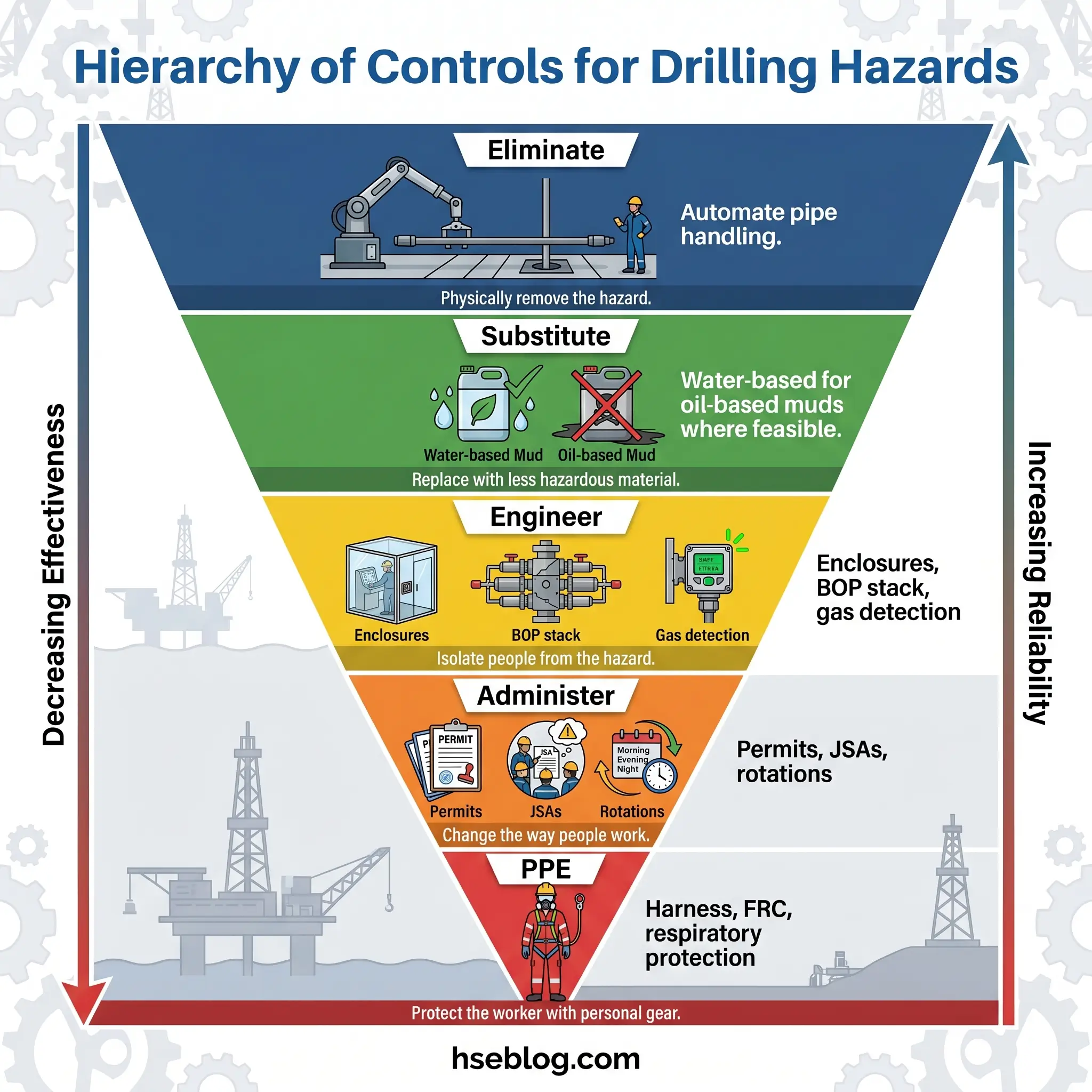 On a land rig where the operator had converted to power tongs and an iron roughneck two years earlier, the toolpusher put it simply: “The old rig wrote three finger claims a year. The new one wrote none.” That is the hierarchy of controls in one sentence — replace the manual operation with a mechanical one, and you eliminate the exposure.