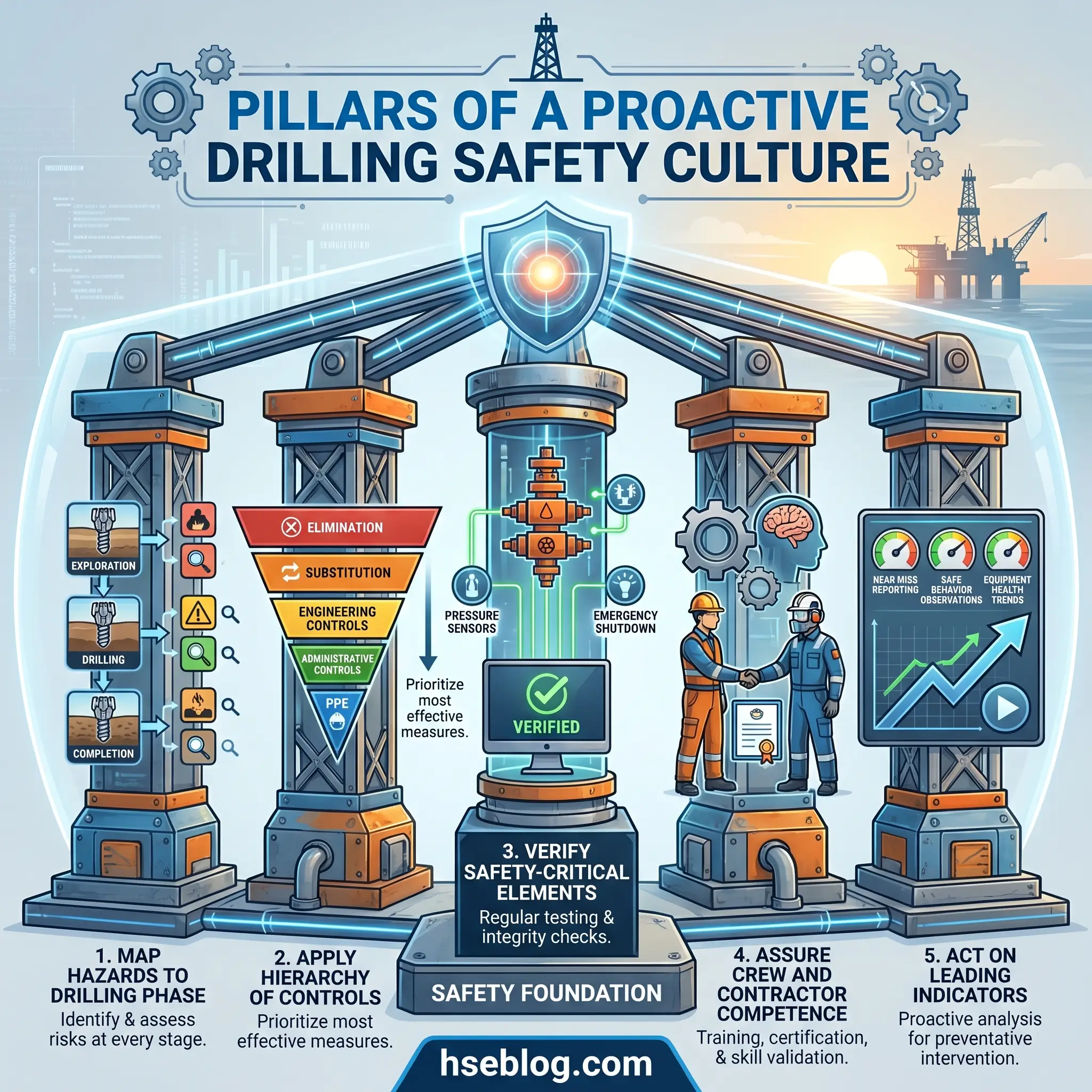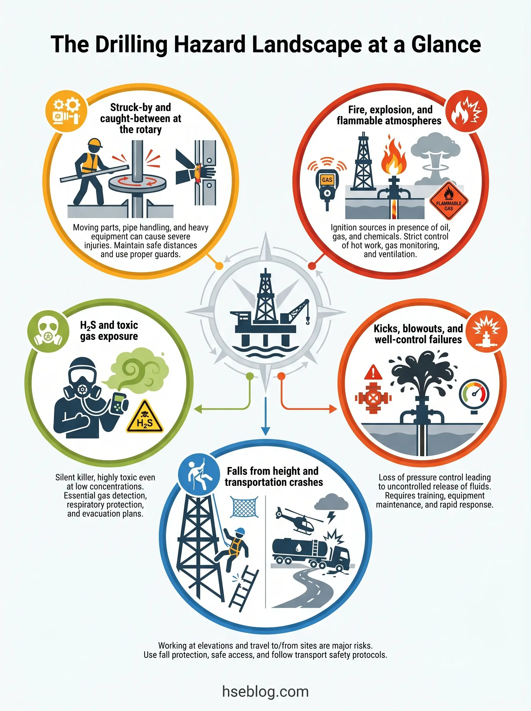 The cost of getting it wrong is measured in lives, multi-million-dollar blowouts, and prosecutions that end careers. The cost of getting it right, consistently, is a rig that finishes the section on schedule with nothing to report. This guide walks through the full hazard landscape of modern drilling operations — struck-by and caught-between injuries at the rotary, fire and explosion risk from uncontrolled hydrocarbons, kicks and blowouts that define well-control discipline, H₂S exposure in sour fields, work at height on the monkeyboard, and the transportation, chemical, noise, ergonomic, and electrical hazards that often get shorter treatment than they deserve. Each hazard is mapped to specific prevention measures ordered along the hierarchy of controls, with the regulatory framework that anchors each requirement under both US and UK regimes.