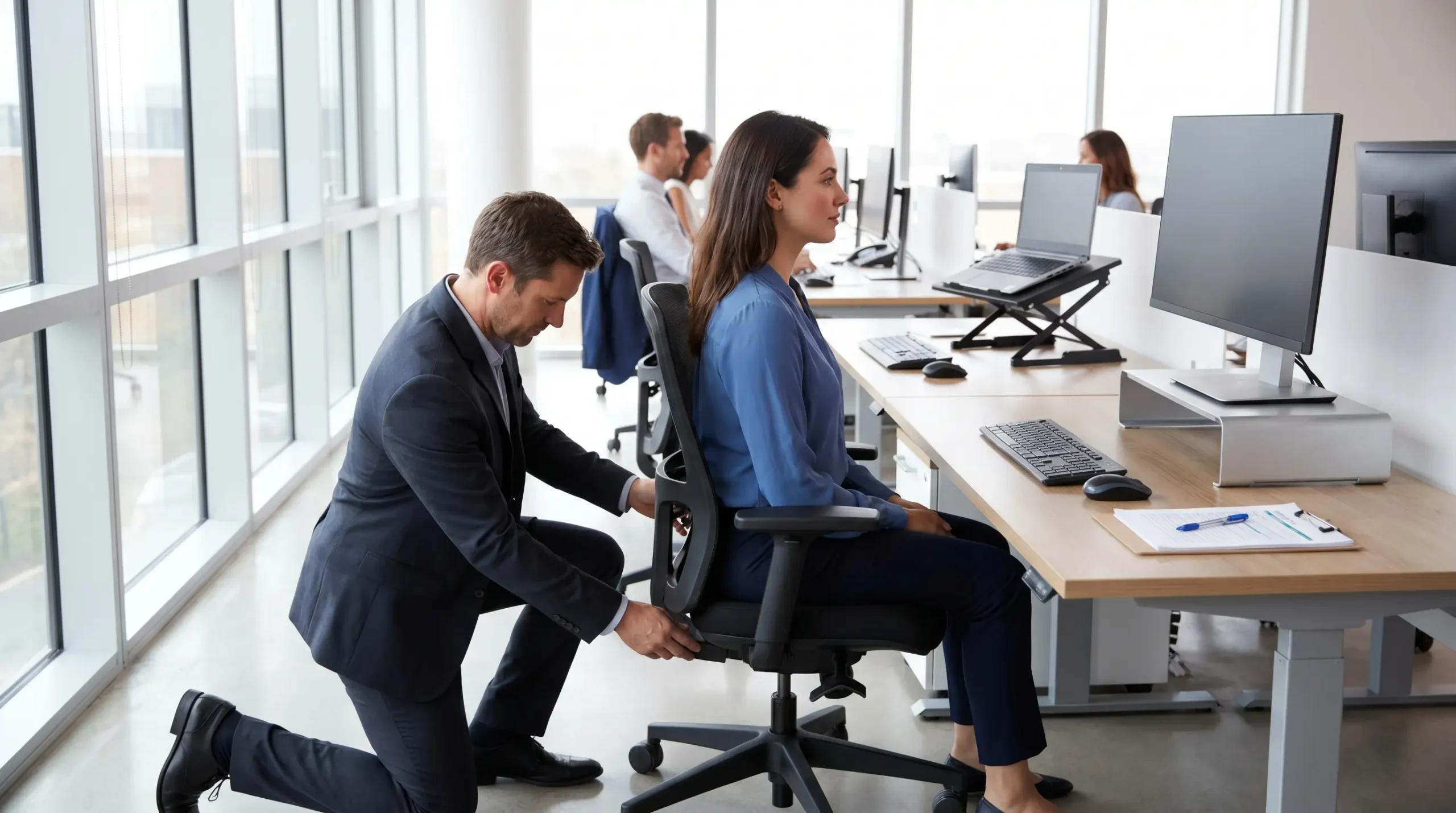 Pregnant workers need reassessment as their posture changes through pregnancy. The chair, desk height, and monitor position that worked at 12 weeks may be inadequate at 30 weeks.