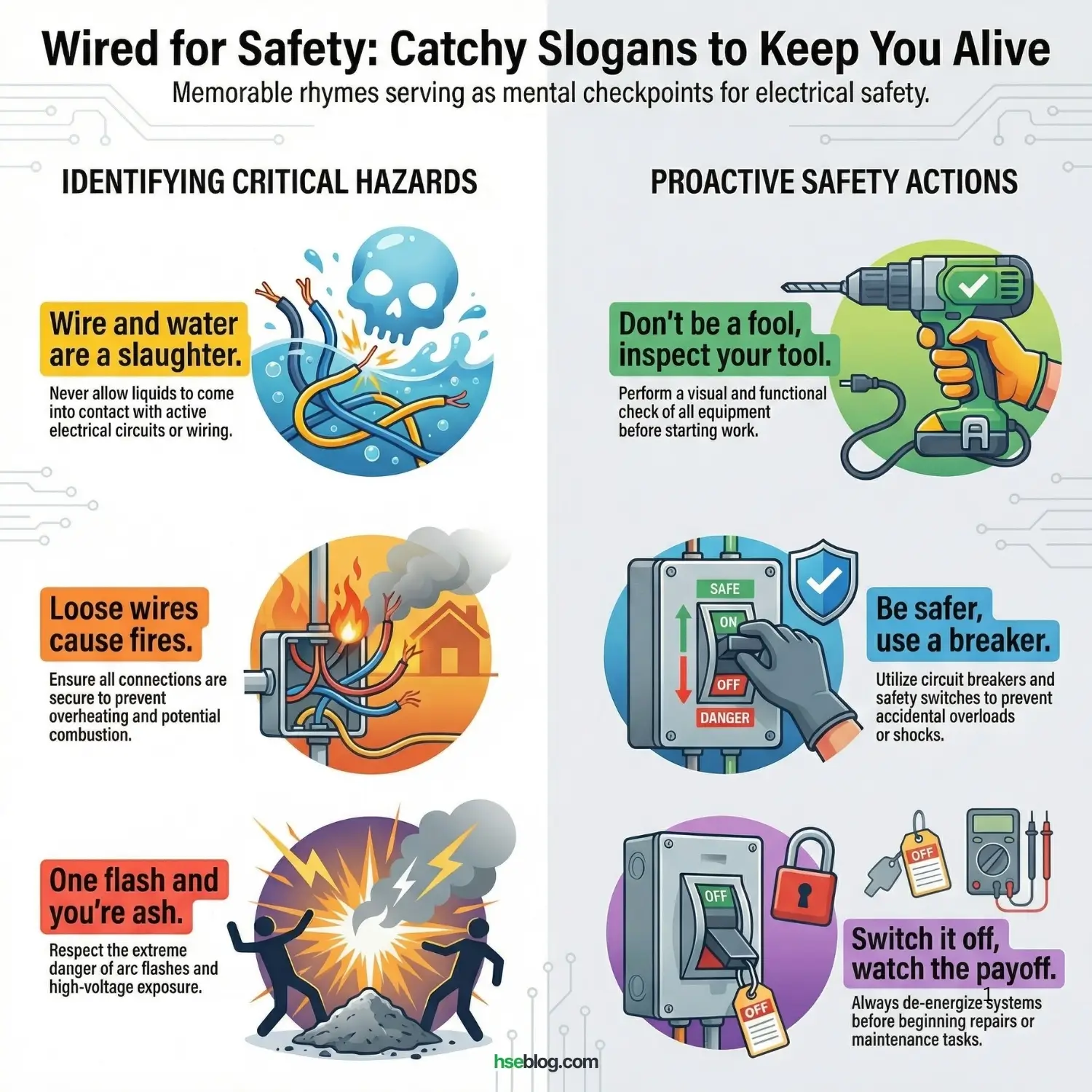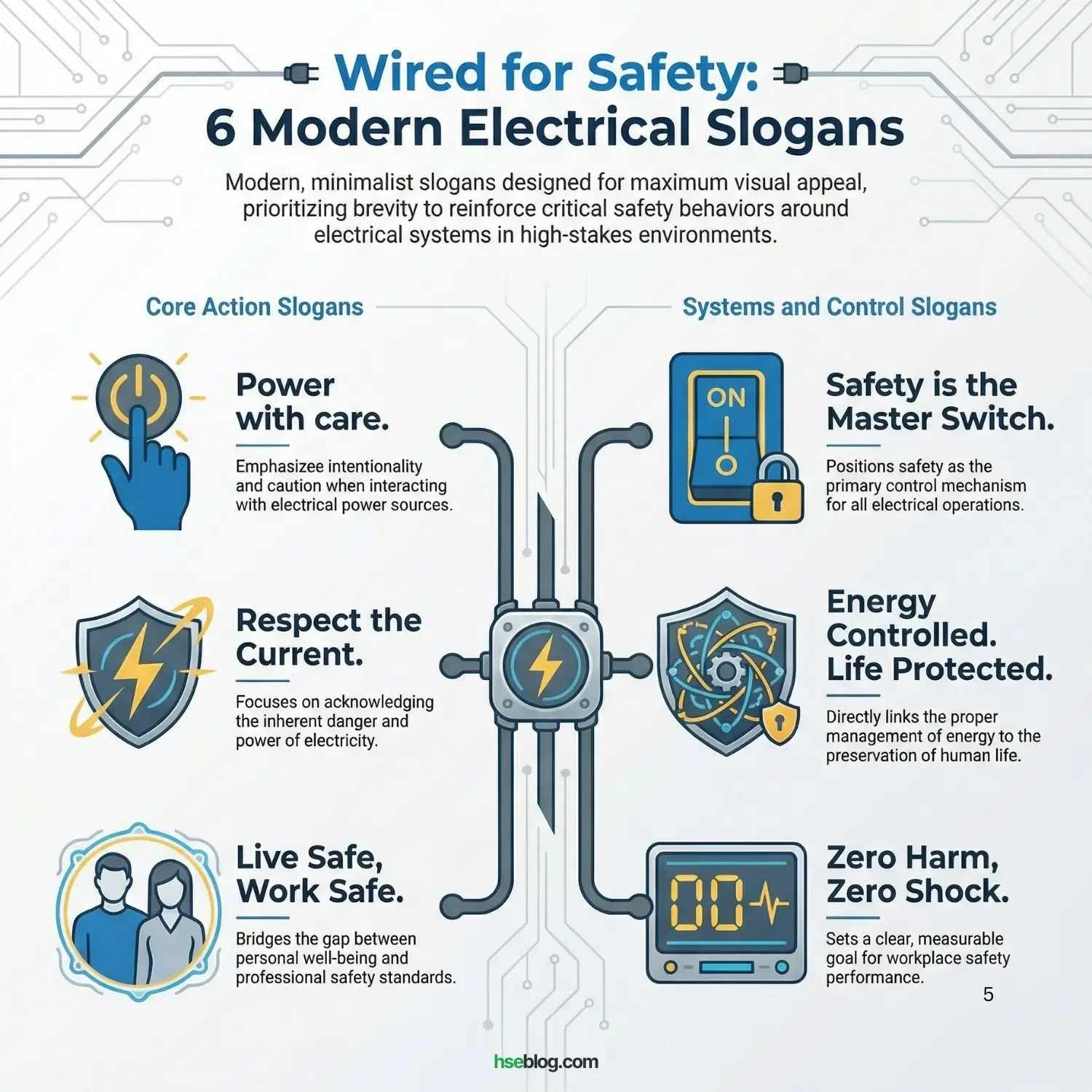 These slogans are the backbone of general awareness campaigns. I often use these for site-wide banners and during general induction training to set the baseline expectation for electrical compliance.