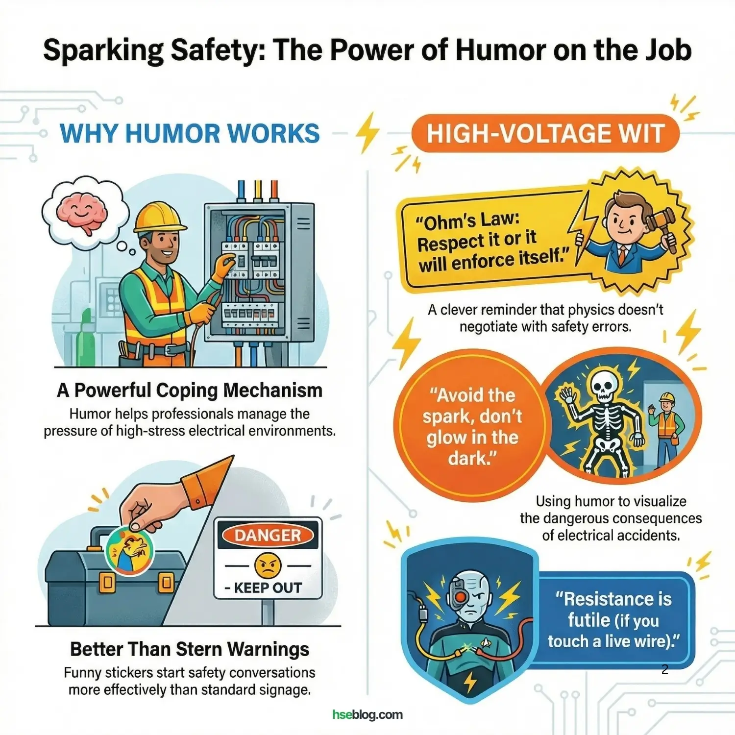 Humor is a powerful coping mechanism in high-stress environments. I have found that a funny slogan on a helmet sticker or a toolbox often starts a conversation more effectively than a stern warning sign.