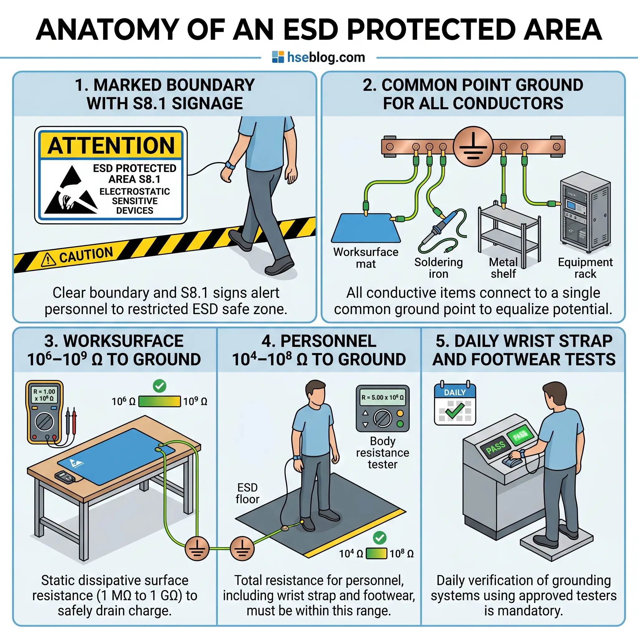 - Electrostatic Protected Areas (EPAs) — bounded work zones with dissipative flooring, worksurfaces, and controlled access. Signage requirements sit in ANSI/ESD S8.1.