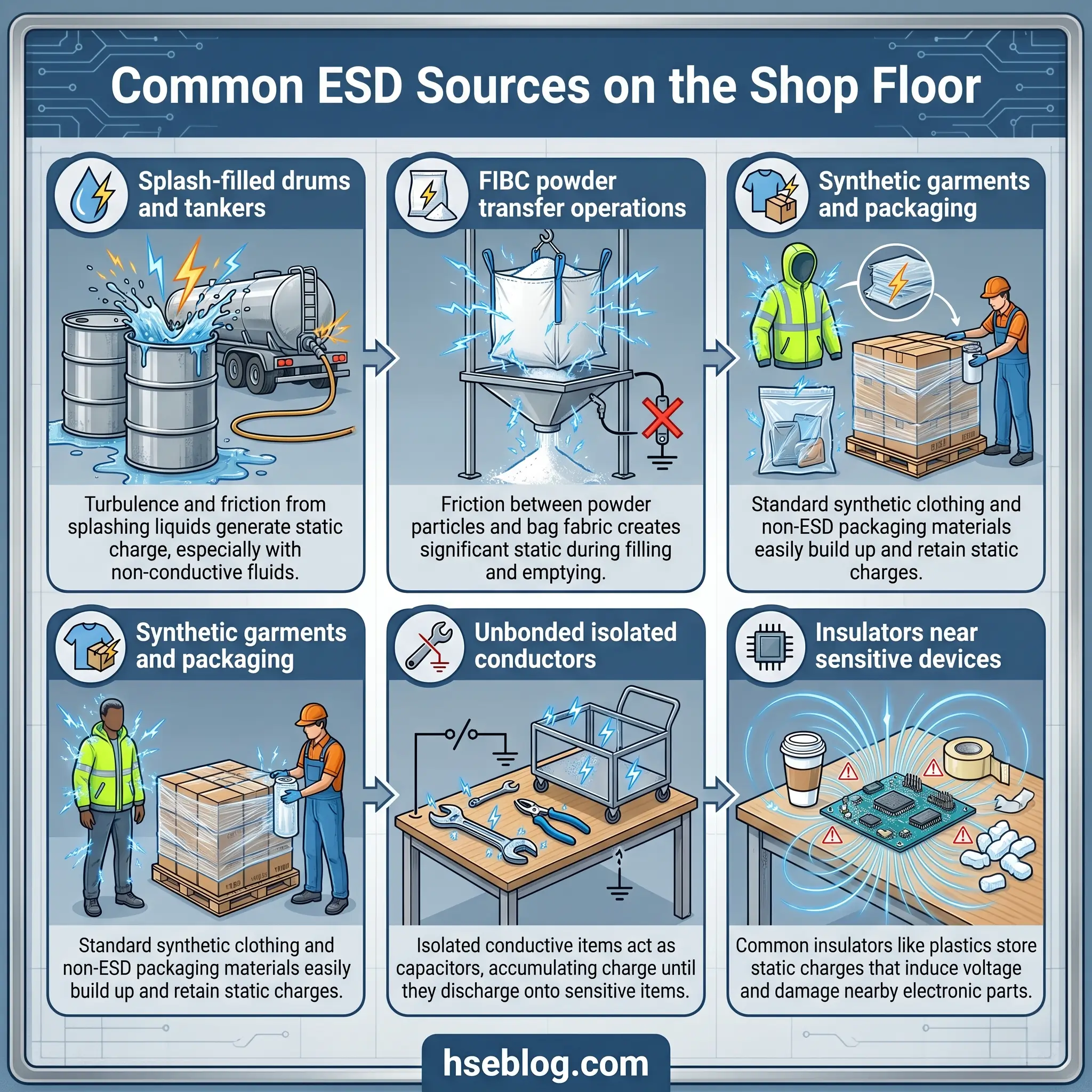 - Ungrounded handling tools — tweezers, scoops, vacuum nozzles without dissipative paths to ground.