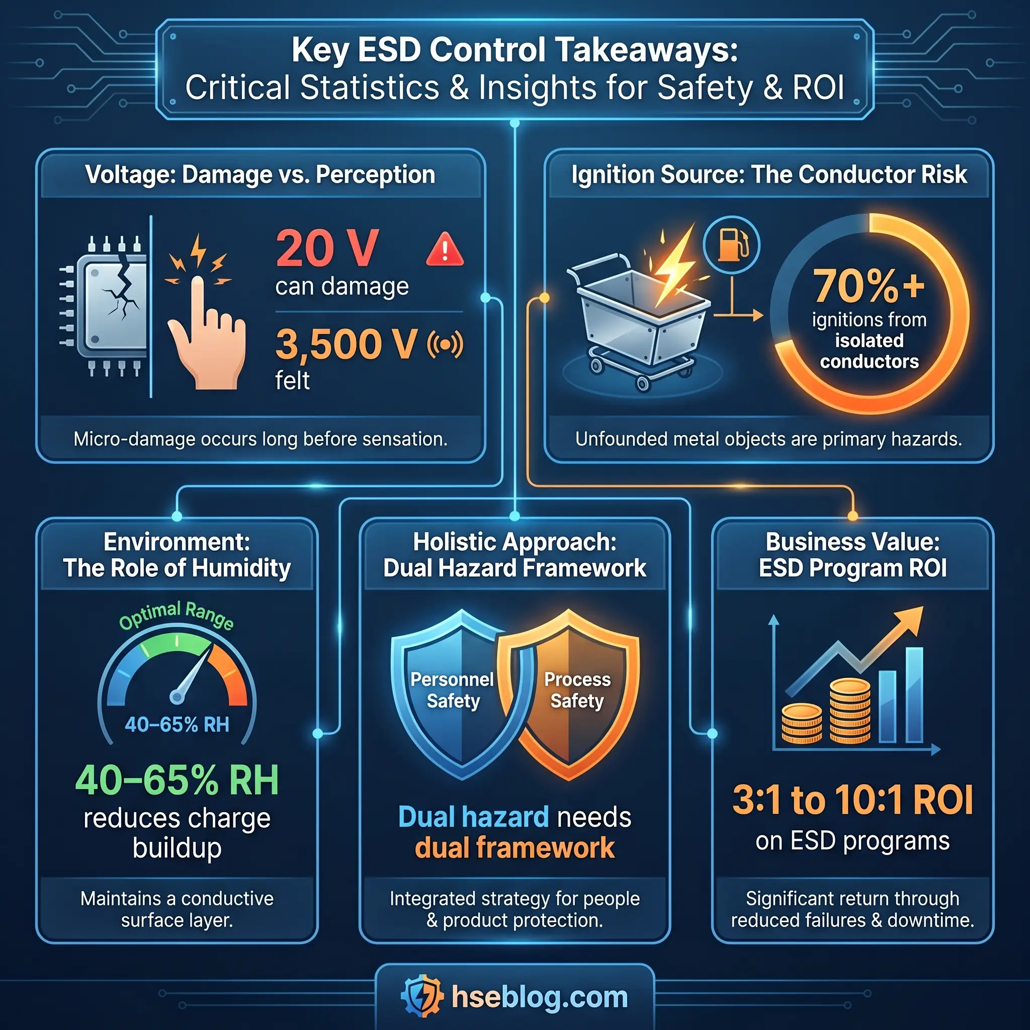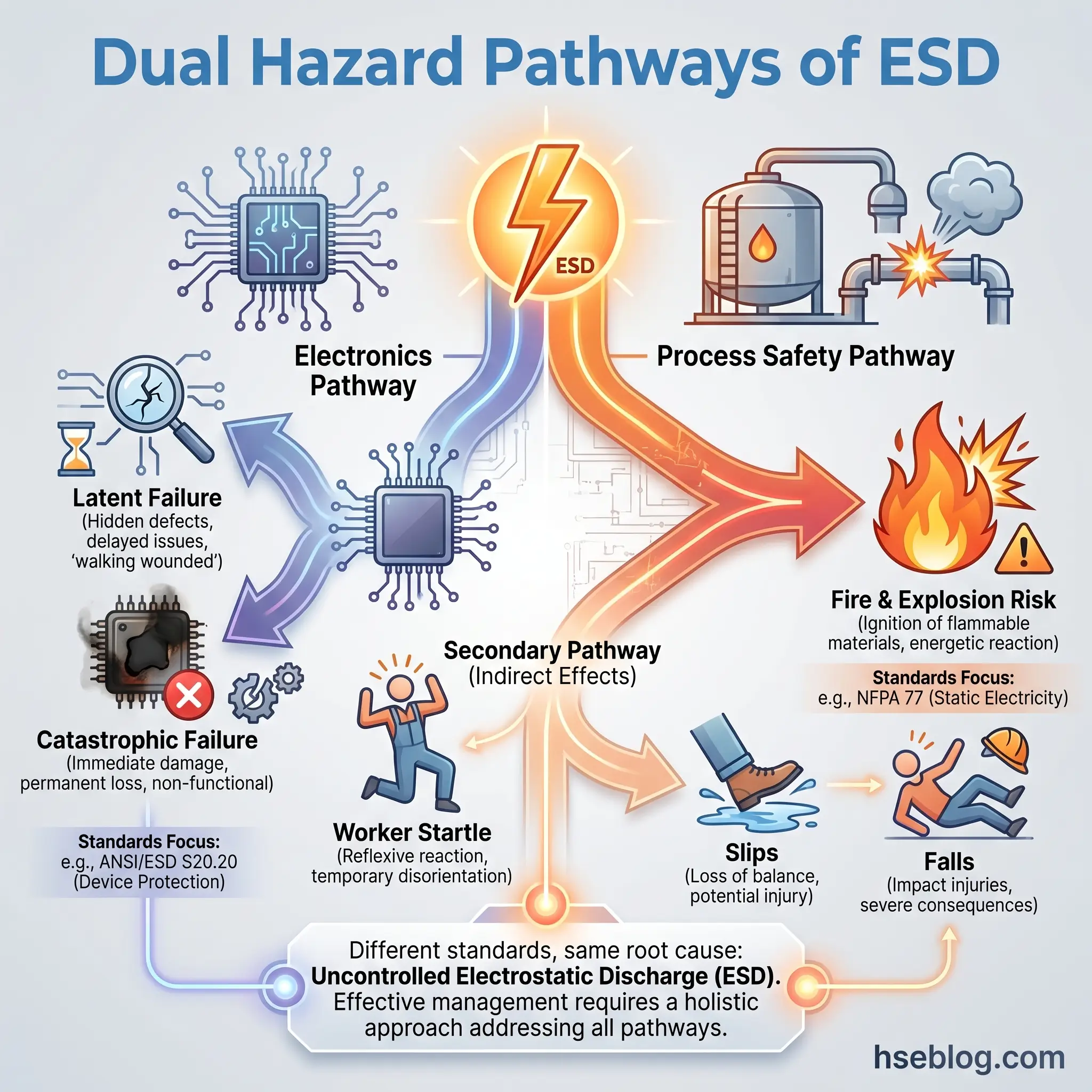 The industry consistently gets one thing wrong about electrostatic discharge: it treats the phenomenon as either an electronics reliability nuisance or a process-safety ignition risk, but almost never as both at the same time. That split is how damaged latent defects reach safety-critical systems, and it is how well-intentioned bonding programs still end up igniting solvent vapors because nobody noticed the unbonded trolley in the transfer bay. An ESD control program that does not explicitly address both pathways, with separate assessments feeding a unified permit and audit system, has a gap — and that gap is where the serious incidents live.