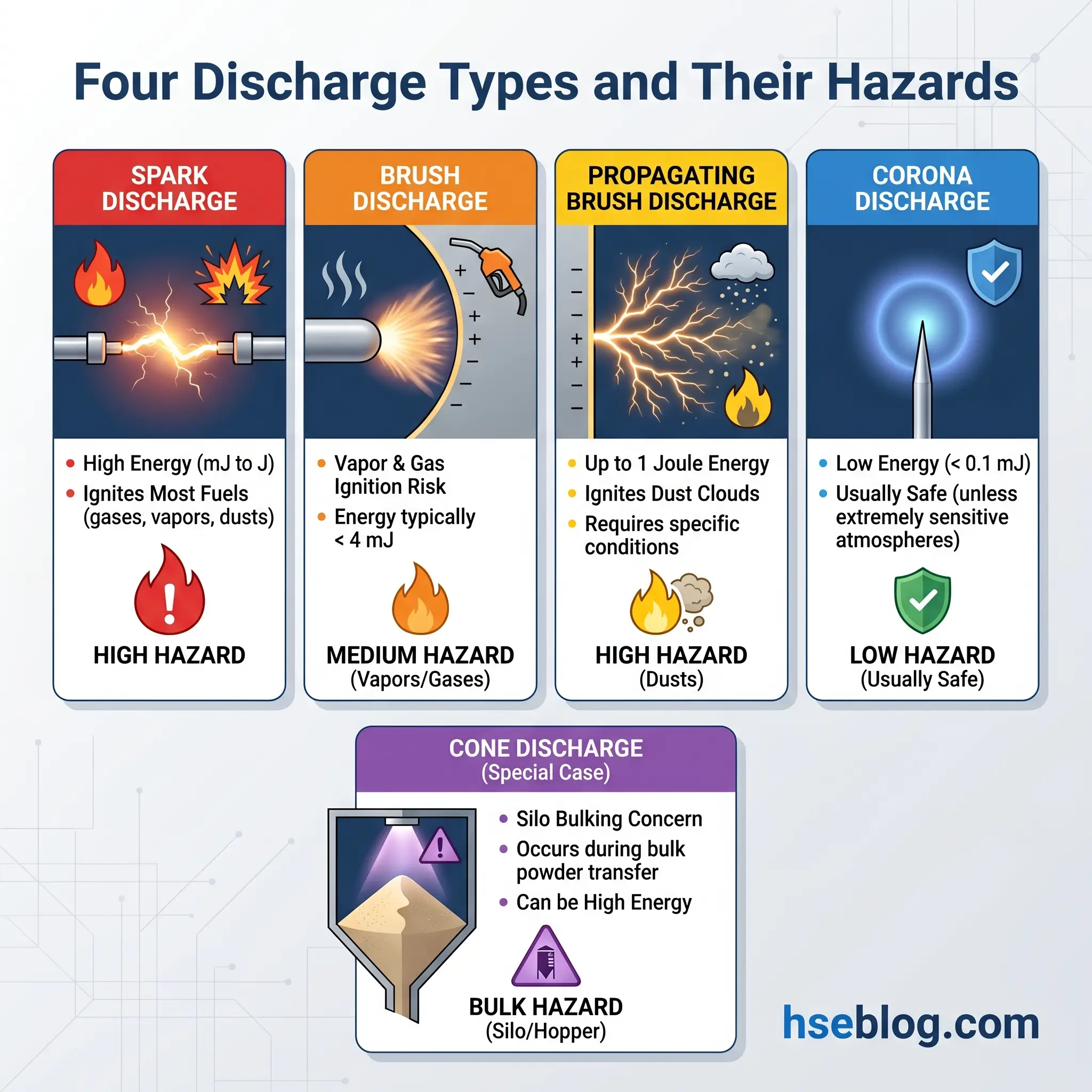 | Discharge type | Mechanism | Typical energy | Primary hazard context |