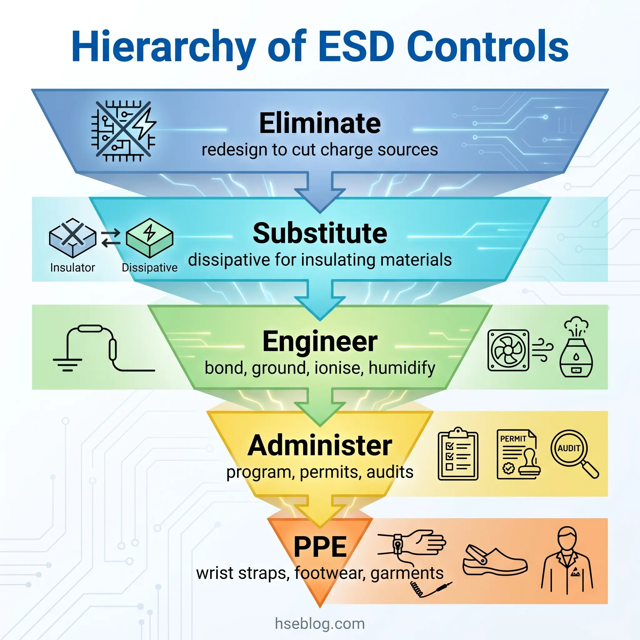 Manufacturer catalogues will sell you a wrist strap in twenty minutes. Building an ESD control program takes months and requires every tier of the hierarchy of controls. The structure below is how I organise prevention, and it is how I recommend auditors test whether a program is real or performative.