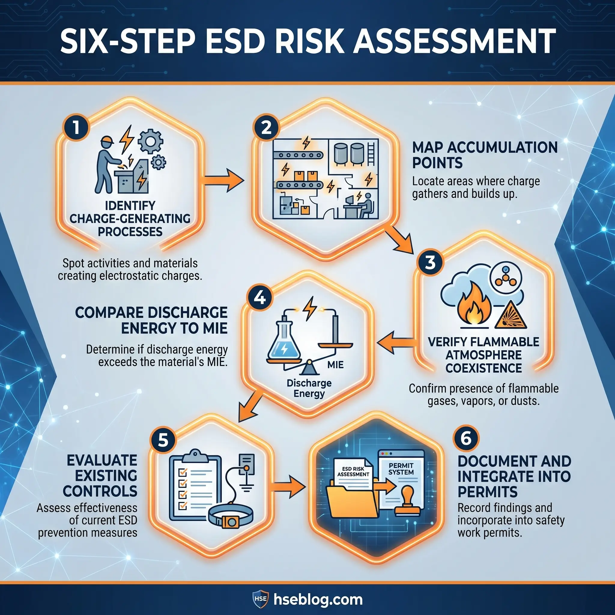 IEC 60079-32-1 is explicit on this point: electrostatic hazards must be assessed for every activity in an explosive atmosphere, not assumed away because generic controls are in place. NFPA 77 carries the same logic for general industry. The six-step workflow below is the one I use with process engineers and integrate into our Dust Hazard Analysis (DHA) and permit-to-work systems.
