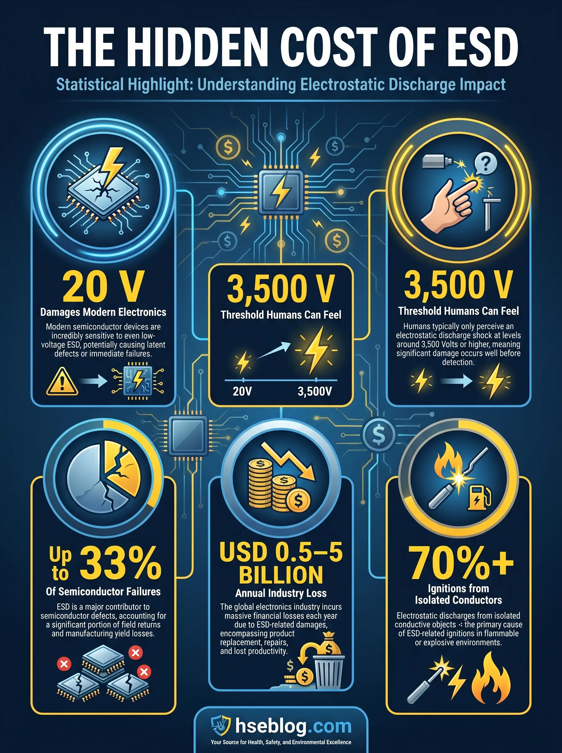 Electrostatic discharge (ESD) occupies an unusual place in my HSE work. It is the only hazard on our site that can destroy a €400 control board at 20 volts and kill three operators at 25 millijoules. Most workplaces treat those as separate problems, managed by different departments — electronics reliability on one side, process safety on the other. They are not separate. This article covers the physics of charge generation, the four discharge types recognised by IEC 60079-32-1, the dual pathways through which ESD causes harm, the regulatory framework spanning ANSI/ESD S20.20 to NFPA 77, and the control measures that actually prevent incidents on the shop floor.