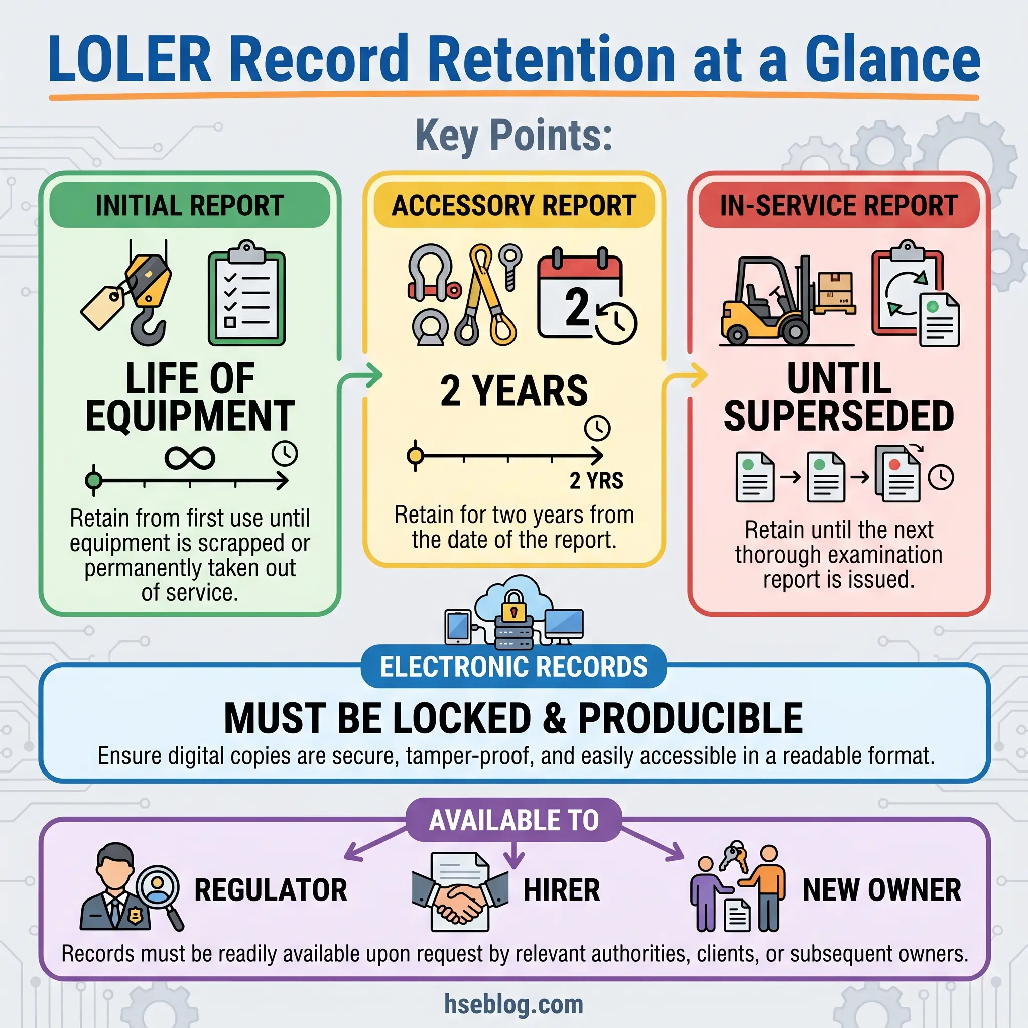 Record keeping is where most LOLER audit findings land, because the retention rules are not uniform — different document types have different retention periods, and duty holders who apply a single blanket rule usually end up either discarding documents they needed or keeping documents they did not.