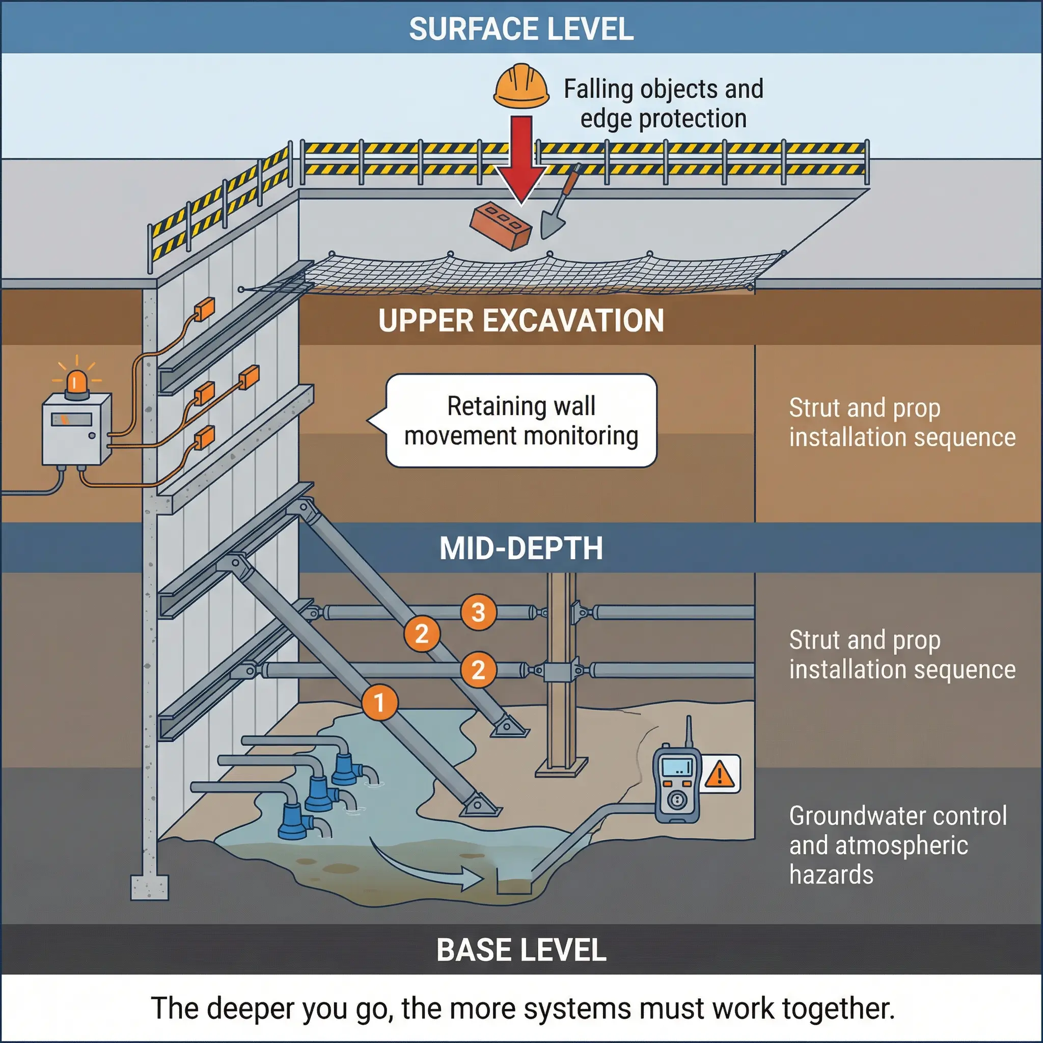 - Falling objects and materials: Workers at the base of a 12-meter excavation are exposed to tools, materials, and debris falling from the surface or from intermediate working levels. Exclusion zones, toe boards, edge protection, and secured tool lanyards are mandatory.