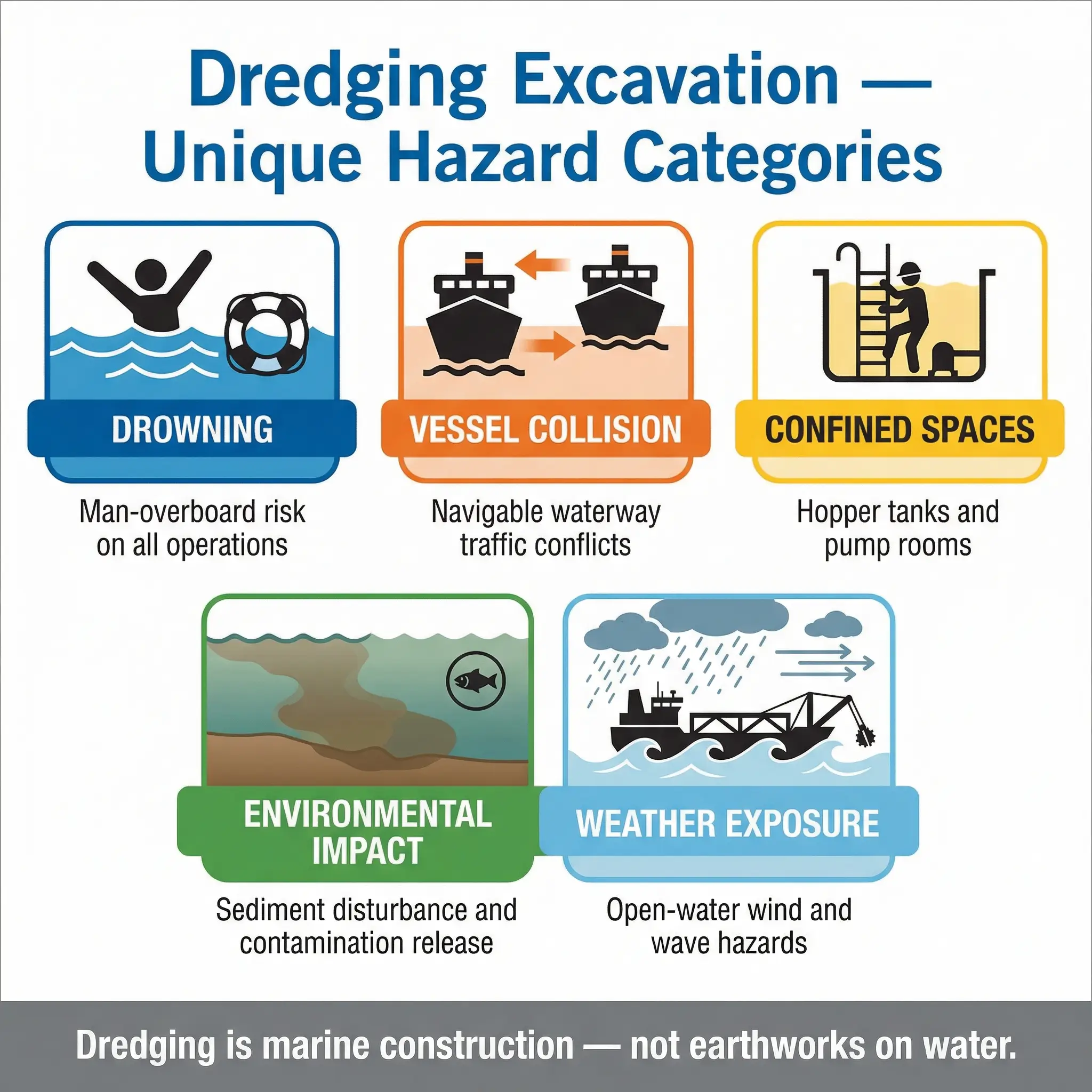 Dredging is a specialist discipline that sits at the intersection of marine operations, geotechnical engineering, and environmental management. The HSE risk profile is fundamentally different from land-based excavation because the work environment itself — open water — introduces drowning, vessel collision, weather exposure, and confined space hazards that do not exist on terrestrial sites.